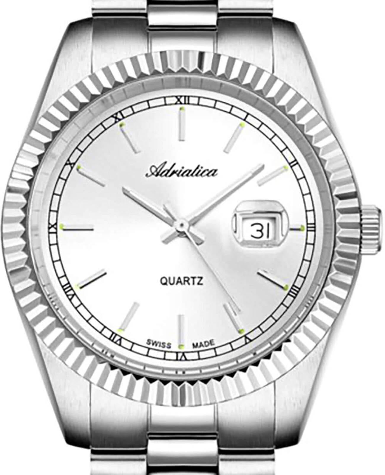 Женские кварцевые часы Adriatica A3090.5113QXL — воплощение швейцарской элегантности в классическом серебристом исполнении. Круглый корпус размером 36 мм из полированной нержавеющей стали, циферблат с солнечной текстурой Sunray и штрихами, окошко даты в положении 3 часов. Стекло — минеральноеМинеральное стеклоМинеральное стекло представляет собой искусственно выращенный минерал кварца. Такое стекло отличается особой устойчивостью к повреждениям и царапинам. Уступает по некоторым качествам сапфировому стеклу. с сапфировым покрытиемСапфировое стеклоПрочный и надёжный материал из кристалла сапфира синтетического происхождения, характеризующийся особой твёрдостью и устойчивостью к царапинам и повреждениям.. Механизм — швейцарский кварцевый Ronda 785. Водонепроницаемость 50 м. Рифлёный безельБезельВнешний ободок, закрепляющий стекло. В спортивных часах так называется поворотное кольцо с делениями на циферблате, выполняет роль таймера – замеряет отрезки времени на шкале. Неподвижный безель – элемент декора. Однонаправленно вращающийся безель на дайверских часах позволяет фиксировать моменты погружения и выныривания на поверхность. и рифлёная заводная головка подчёркивают изысканность дизайна. Браслет — стальной на раскладной застёжкеРаскладная застёжкаТакой тип застёжки используется только на браслетах из металла. Она никогда не раскрывается полностью, происходит разделение на 2 и более частей. Раскладывающая застёжка снизит вероятность потери часов к минимуму.. Идеальный выбор для тех, кто ценит швейцарское качество и утончённую классику.