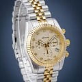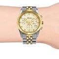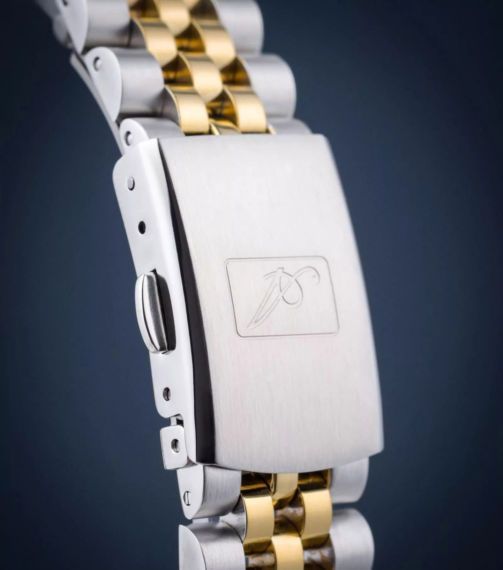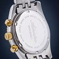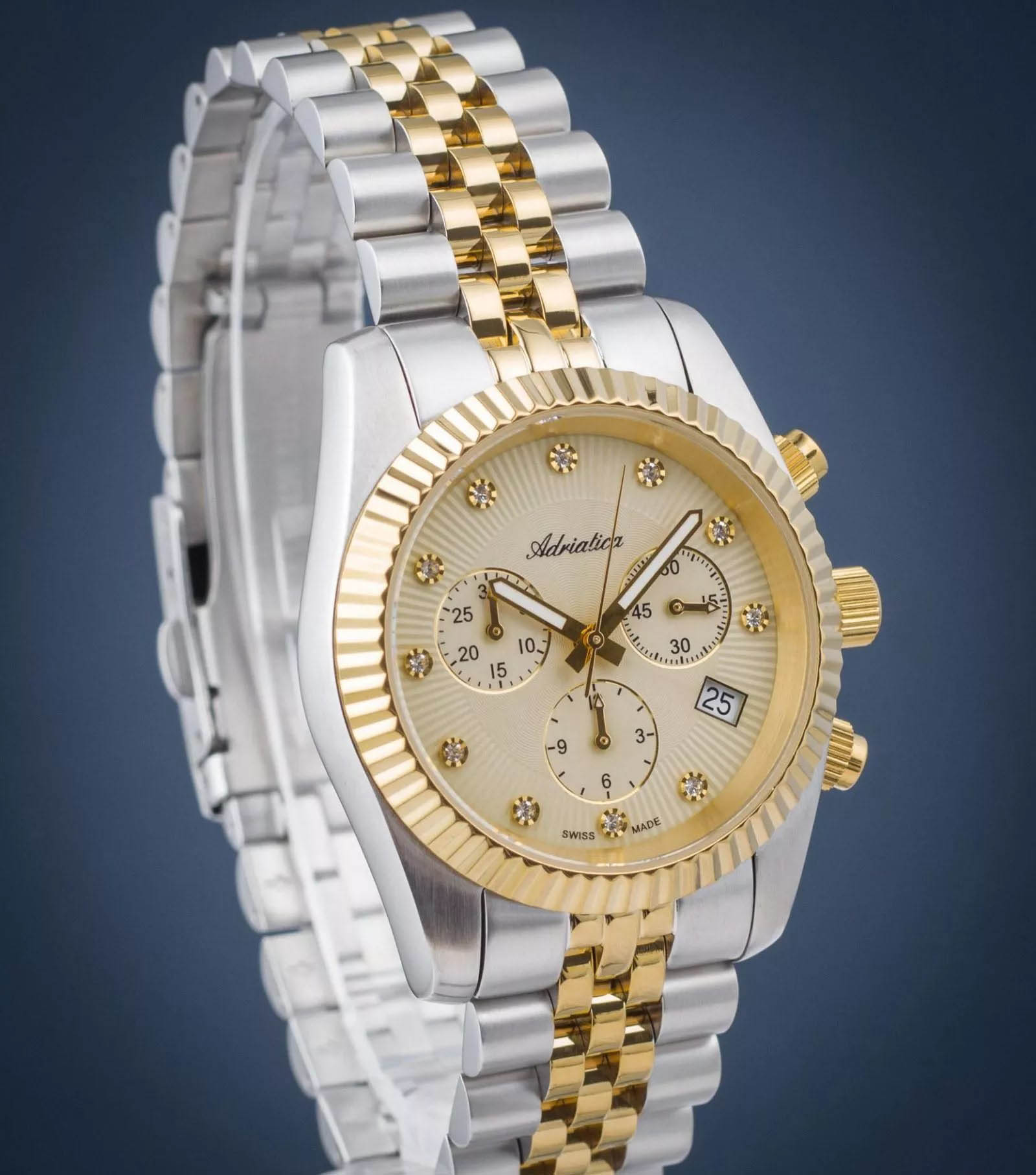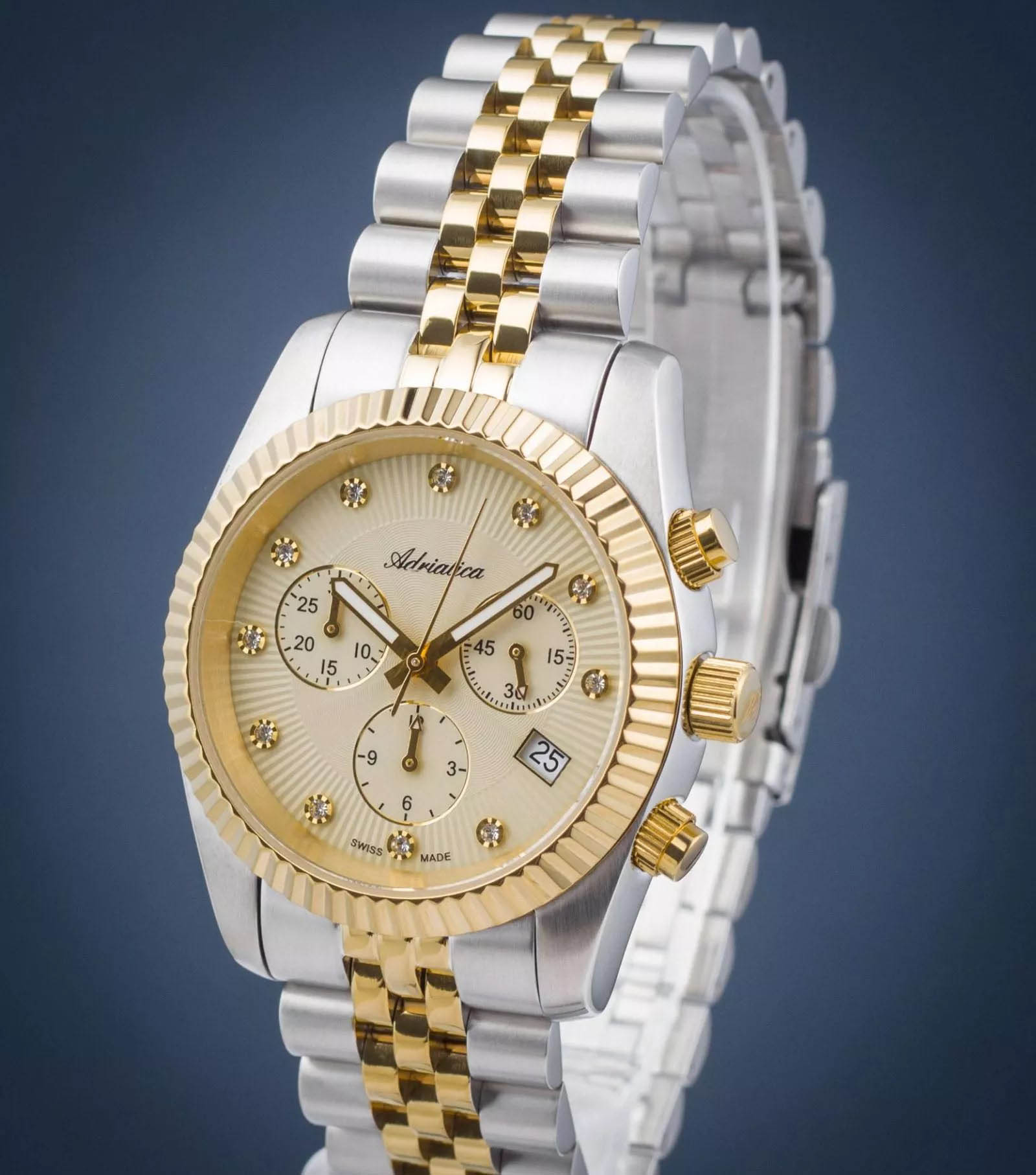 Швейцарские наручные часы-хронографХронографФункция позволяет измерять отрезки времени с особой точностью: часы, минуты, секунды. Верным признаком хронографа является наличие на циферблате 3 дополнительных окошек-счётчиков. с секундомеромСекундомерСекундоме́р — прибор, способный измерять интервалы времени с точностью до долей секунды. Adriatica A3809.2141CH, кварцевый механизм с высокой точностью. Минеральное стеклоМинеральное стеклоМинеральное стекло представляет собой искусственно выращенный минерал кварца. Такое стекло отличается особой устойчивостью к повреждениям и царапинам. Уступает по некоторым качествам сапфировому стеклу. устойчивое к мелким механическим повреждениям. Класс водозащиты: 50 метров, позволит защитить корпус от случайных брызг или капель дождя. Корпус часов изготовлен из стали. БезельБезельВнешний ободок, закрепляющий стекло. В спортивных часах так называется поворотное кольцо с делениями на циферблате, выполняет роль таймера – замеряет отрезки времени на шкале. Неподвижный безель – элемент декора. Однонаправленно вращающийся безель на дайверских часах позволяет фиксировать моменты погружения и выныривания на поверхность. с PVD-покрытиемPVDУльтратонкое покрытие наносится в технике вакуумного напыления, сочетает в себе нитрид титана особой прочности со слоем золота или оксида хрома. Несёт в себе декоративную или защитную функцию.. Стальной браслет на раскладной застёжкеРаскладная застёжкаТакой тип застёжки используется только на браслетах из металла. Она никогда не раскрывается полностью, происходит разделение на 2 и более частей. Раскладывающая застёжка снизит вероятность потери часов к минимуму. с PVD-покрытиемPVDУльтратонкое покрытие наносится в технике вакуумного напыления, сочетает в себе нитрид титана особой прочности со слоем золота или оксида хрома. Несёт в себе декоративную или защитную функцию.. Окошко даты находится в положении между 4 и 5 часов. Циферблат инкрустирован фианитами. Стрелки с люминесцентным покрытиемЛюминесцентное покрытиеПозволяет считывать показания времени в темноте. Производители наносят на стрелки, часовые индексы, безель или поверхность циферблата светонакопительный состав, дающий холодное свечение..