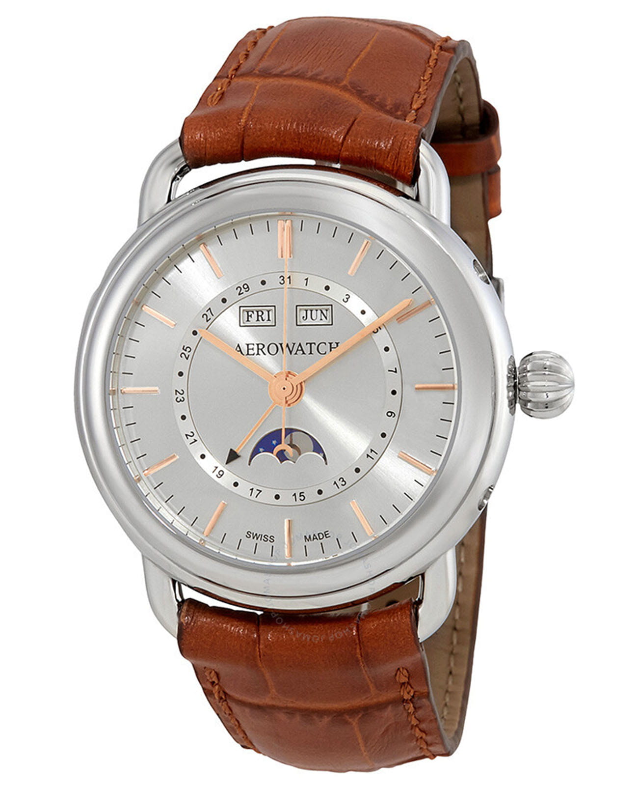 Мужские механические швейцарские часы-хронографХронографФункция позволяет измерять отрезки времени с особой точностью: часы, минуты, секунды. Верным признаком хронографа является наличие на циферблате 3 дополнительных окошек-счётчиков. с автоподзаводом Aerowatch 1942 75970 AA02 Сапфировое стеклоСапфировое стеклоПрочный и надёжный материал из кристалла сапфира синтетического происхождения, характеризующийся особой твёрдостью и устойчивостью к царапинам и повреждениям. устойчивое к появлению царапин, обладающее высокой прозрачностью. В модели установлен калибр 11 1/2''' Dubois-Dépraz 9000 на базе SW 200, 26 камней, покрытый родием ротор, декорированный орнаментом "Côtes de Genève". Корпус изготовлен из нержавеющей стали. На циферблате расположены индексы с PVDPVDУльтратонкое покрытие наносится в технике вакуумного напыления, сочетает в себе нитрид титана особой прочности со слоем золота или оксида хрома. Несёт в себе декоративную или защитную функцию. покрытием, календарь на 12 часах, дата по стрелке, фаза луны в положении 6 часов. Класс водозащиты: 50 метров, позволит защитить корпус от случайных брызг или капель дождя. Кожаный ремешок на застёжке «бабочка» с кнопкамиЗастёжка "бабочка"Такой вид застёжки дополняется предохранителями, помогающими избежать случайного раскрытия браслета. Обладают изящным исполнением. .