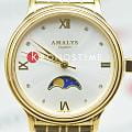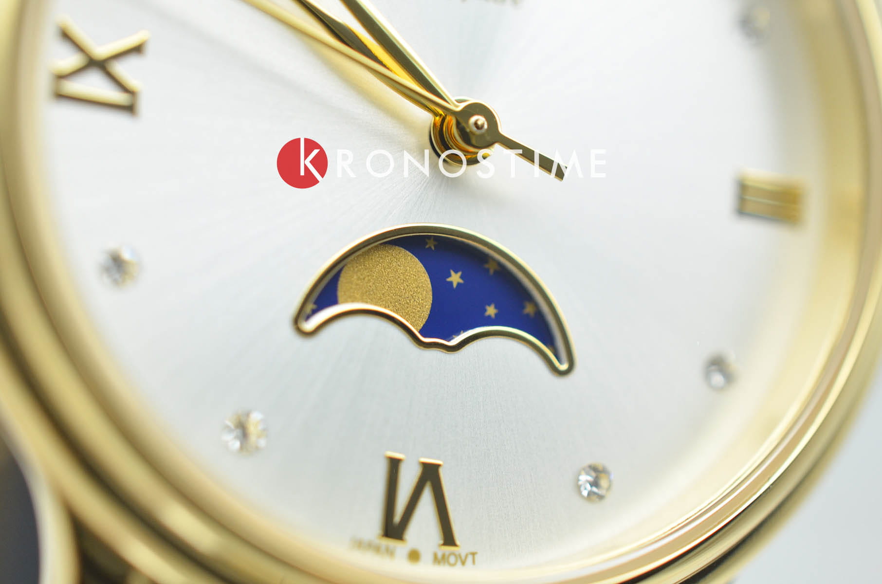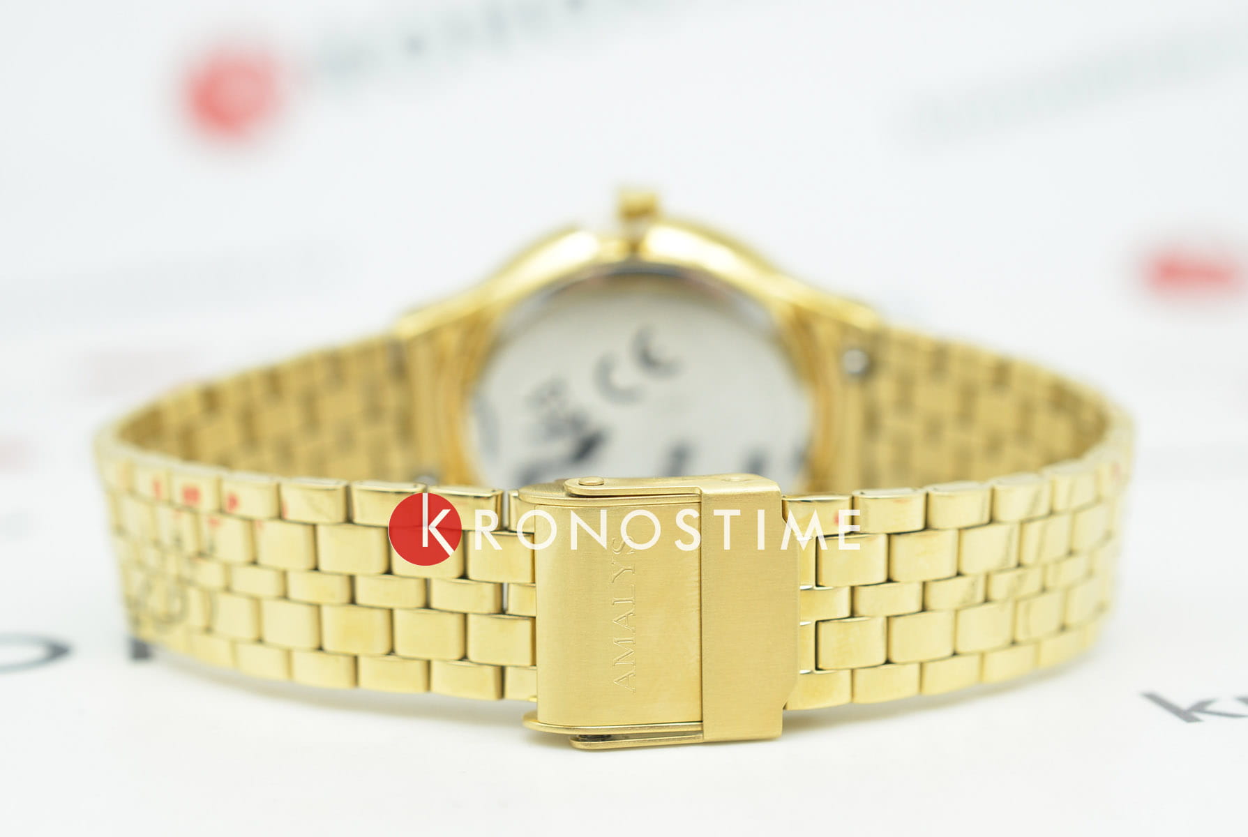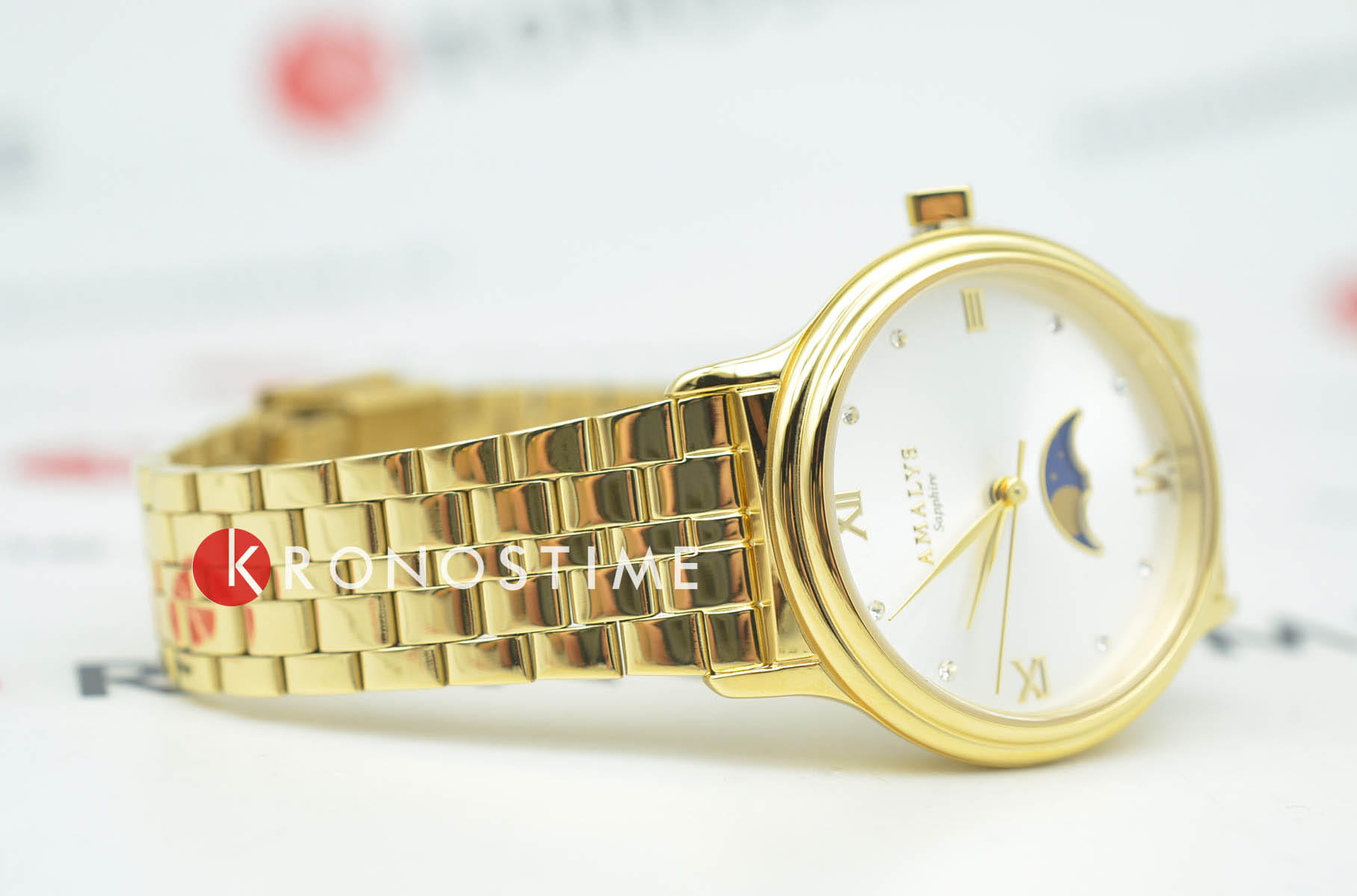Amalys AMW-204 — женская модель с элегантным классическим стилем и утончёнными деталями. Круглый корпус изготовлен из нержавеющей стали с PVDPVDУльтратонкое покрытие наносится в технике вакуумного напыления, сочетает в себе нитрид титана особой прочности со слоем золота или оксида хрома. Несёт в себе декоративную или защитную функцию.-покрытием золотистого оттенка и гармонирует с браслетом в том же исполнении, состоящим из звеньев и обеспечивающим комфортное прилегание к запястью. Защитную функцию выполняет сапфировое стеклоСапфировое стеклоПрочный и надёжный материал из кристалла сапфира синтетического происхождения, характеризующийся особой твёрдостью и устойчивостью к царапинам и повреждениям., которое отличается стойкостью к царапинам и сохраняет высокую прозрачность. В основе лежит кварцевый механизм, гарантирующий точность хода и простоту эксплуатации. Циферблат украшен изящными римскими цифрами и метками, дополнен утончённым индикатором фаз Луны, который придаёт часам особый шарм и делает их акцентной деталью образа. Водозащита 3 ATM защищает от случайных брызг и дождя. Модель сочетает функциональность и изысканность, подойдёт как для повседневного стиля, так и для особых случаев.