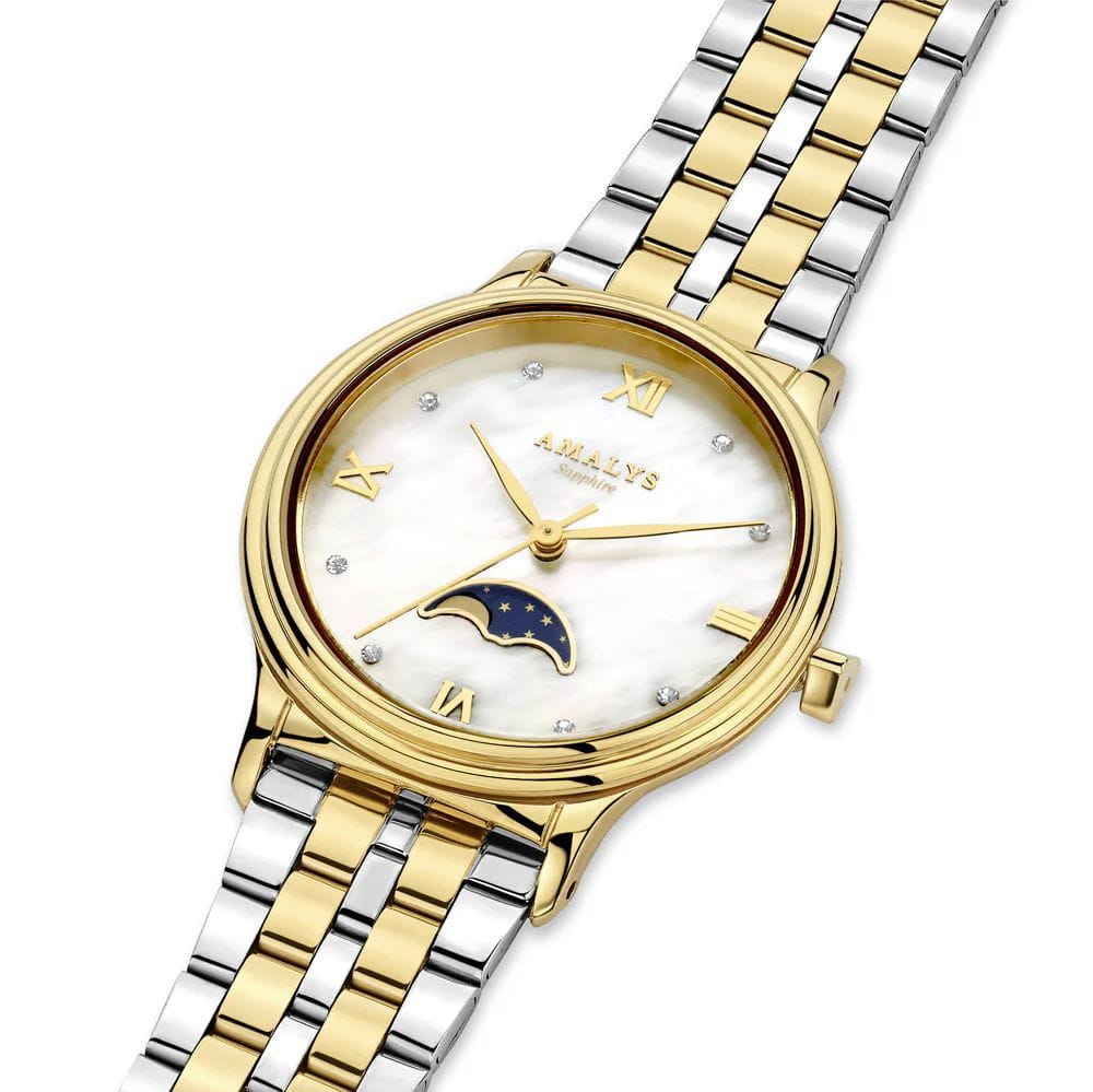Amalys AMW-205 — женская модель с элегантным классическим стилем и утончёнными деталями. Круглый корпус изготовлен из нержавеющей стали с PVDPVDУльтратонкое покрытие наносится в технике вакуумного напыления, сочетает в себе нитрид титана особой прочности со слоем золота или оксида хрома. Несёт в себе декоративную или защитную функцию.-покрытием золотистого оттенка и гармонирует с браслетом в том же исполнении, состоящим из звеньев и обеспечивающим комфортное прилегание к запястью. Защитную функцию выполняет сапфировое стеклоСапфировое стеклоПрочный и надёжный материал из кристалла сапфира синтетического происхождения, характеризующийся особой твёрдостью и устойчивостью к царапинам и повреждениям., которое отличается стойкостью к царапинам и сохраняет высокую прозрачность. В основе лежит кварцевый механизм, гарантирующий точность хода и простоту эксплуатации. Циферблат украшен изящными римскими цифрами и метками, дополнен утончённым индикатором фаз Луны, который придаёт часам особый шарм и делает их акцентной деталью образа. Водозащита 3 ATM защищает от случайных брызг и дождя. Модель сочетает функциональность и изысканность, подойдёт как для повседневного стиля, так и для особых случаев.