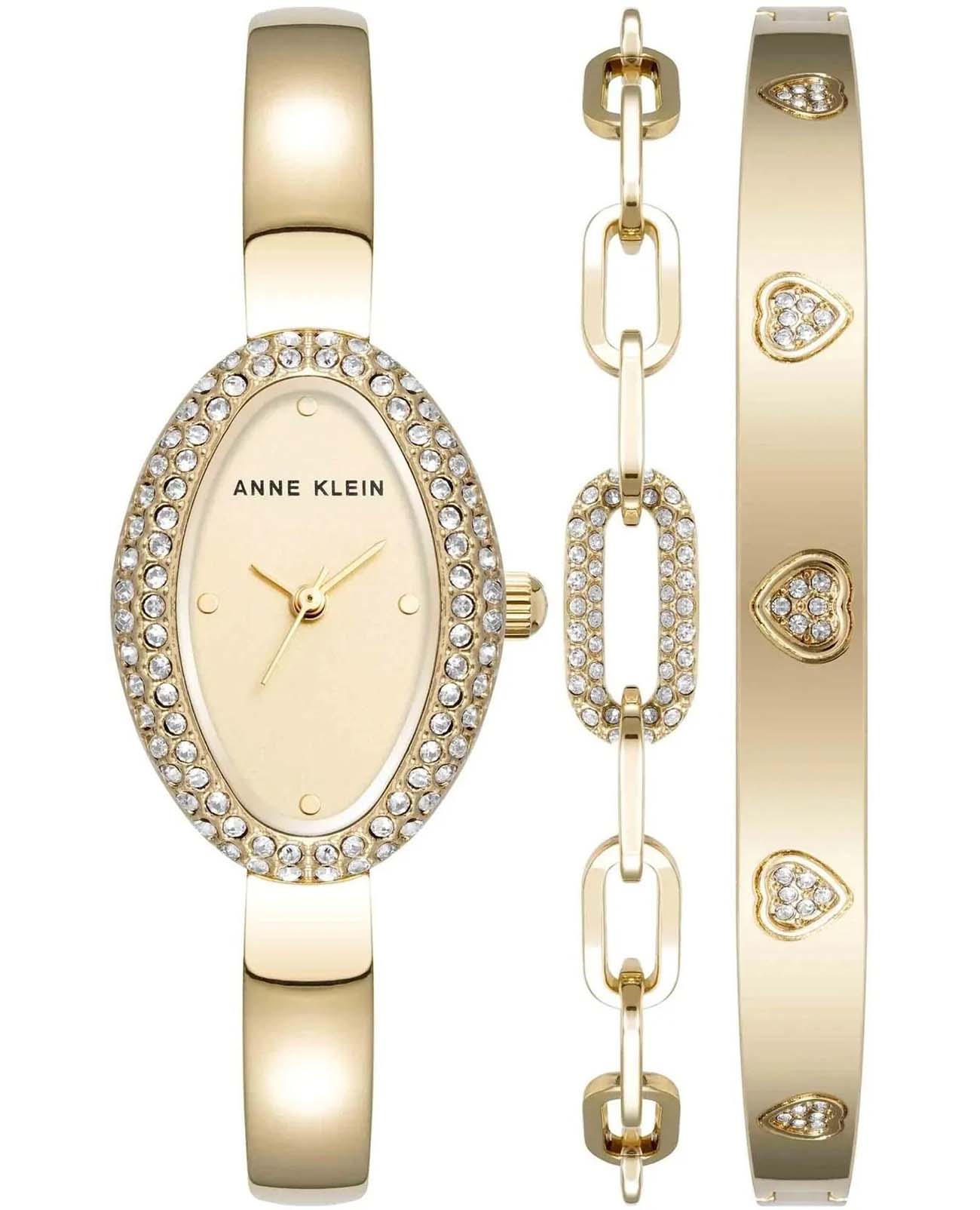 Женские кварцевые часы Anne Klein Box Set 5074GPST представляют собой элегантный аксессуар с овальным корпусом 20×30 мм из латуни с PVDPVDУльтратонкое покрытие наносится в технике вакуумного напыления, сочетает в себе нитрид титана особой прочности со слоем золота или оксида хрома. Несёт в себе декоративную или защитную функцию.-покрытием в золотистом оттенке и обрамленный бриллиантами. Модель оснащена кварцевым механизмом японского производства с точностью хода ±20 секунд в месяц и аналоговой индикацией времени. Циферблат бежевого цвета с позолоченными стрелками защищен минеральным стекломМинеральное стеклоМинеральное стекло представляет собой искусственно выращенный минерал кварца. Такое стекло отличается особой устойчивостью к повреждениям и царапинам. Уступает по некоторым качествам сапфировому стеклу., устойчивым к царапинам. Водонепроницаемость 30 метров (3 атм) обеспечивает защиту от брызг и дождя. Металлический браслет из нержавеющей стали шириной 20 мм и так же обрамленный бриллиантами, гармонично сочетается с корпусом, создавая целостный образ. Часы толщиной 6 мм отличаются утонченным профилем и комфортной посадкой на запястье. Прилагается два дополнительных браслета.