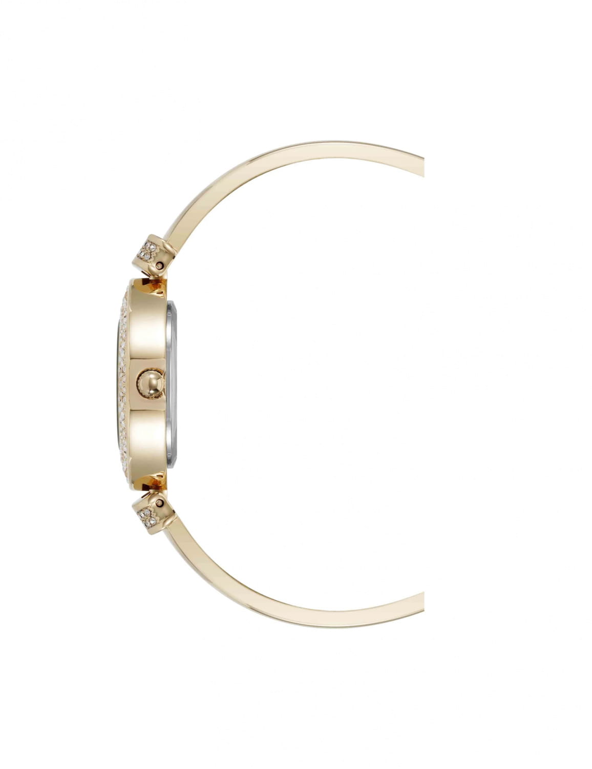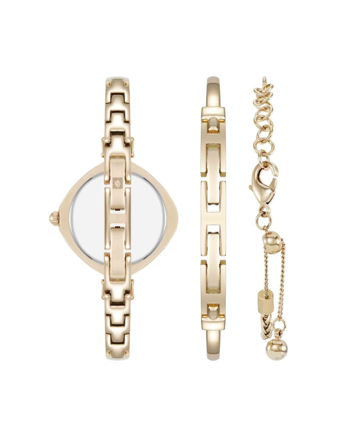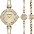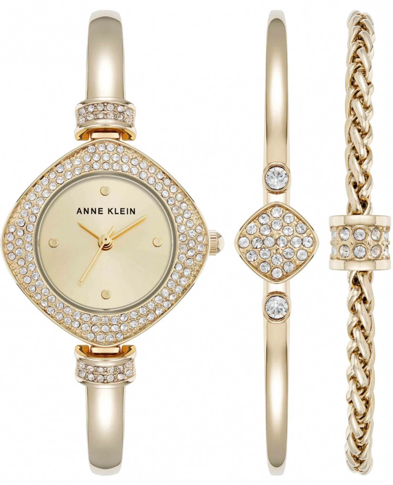 Женские кварцевые часы Anne Klein Box Set 5228GPST представляют собой элегантный аксессуар с круглым корпусом 29 мм из стали с IP-покрытиемIP-покрытиеМетод ионного напыления. Демонстрирует повышенную устойчивость к истиранию, окислению и химическим веществам. Под воздействием высокого давления и температуры около 1500°C молекулы металла надёжно соединяются с частицами корпуса часов. цвета желтого золота и обрамленный кристаллами. Модель оснащена кварцевым механизмом с точностью хода ±20 секунд в месяц. Циферблат с позолоченными стрелками защищен минеральным стекломМинеральное стеклоМинеральное стекло представляет собой искусственно выращенный минерал кварца. Такое стекло отличается особой устойчивостью к повреждениям и царапинам. Уступает по некоторым качествам сапфировому стеклу., устойчивым к царапинам. Водонепроницаемость 30 метров (3 атм) обеспечивает защиту от брызг и дождя. Изысканный браслет из нержавеющей стали с IP-покрытиемIP-покрытиеМетод ионного напыления. Демонстрирует повышенную устойчивость к истиранию, окислению и химическим веществам. Под воздействием высокого давления и температуры около 1500°C молекулы металла надёжно соединяются с частицами корпуса часов. так же обрамленный кристаллами, гармонично сочетается с корпусом, создавая целостный образ. Часы отличаются утонченным профилем и комфортной посадкой на запястье. Прилагается два дополнительных браслета.