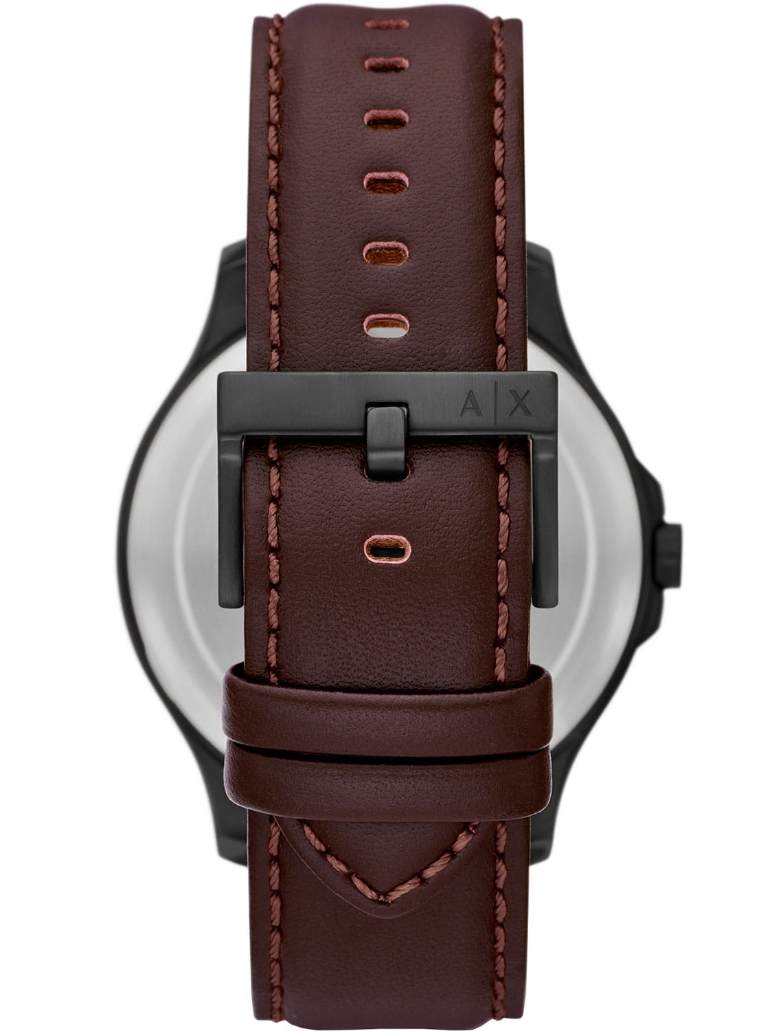 Мужские наручные часы с минеральным стекломМинеральное стеклоМинеральное стекло представляет собой искусственно выращенный минерал кварца. Такое стекло отличается особой устойчивостью к повреждениям и царапинам. Уступает по некоторым качествам сапфировому стеклу. Armani Exchange Hampton AX2446, кварцевый механизм с высокой точностью. Класс водозащиты: 50 метров, позволит защитить корпус от случайных брызг или капель дождя. Корпус часов изготовлен из стали с черным IP-покрытиемIP-покрытиеМетод ионного напыления. Демонстрирует повышенную устойчивость к истиранию, окислению и химическим веществам. Под воздействием высокого давления и температуры около 1500°C молекулы металла надёжно соединяются с частицами корпуса часов.. Кожаный ремешок на стандартной застёжке. Метки в виде штрихов. Окошко даты в положении 3 часа.
