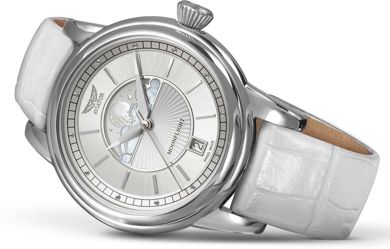 Aviator V.1.33.0.250.4 “Douglas Moonflight” — элегантный дамский швейцарский Moonphaseс утончённой авиационной эстетикой. Корпус 36 мм из нержавеющей стали с полированной отделкой обладает компактными пропорциями и удобным литым профилем.