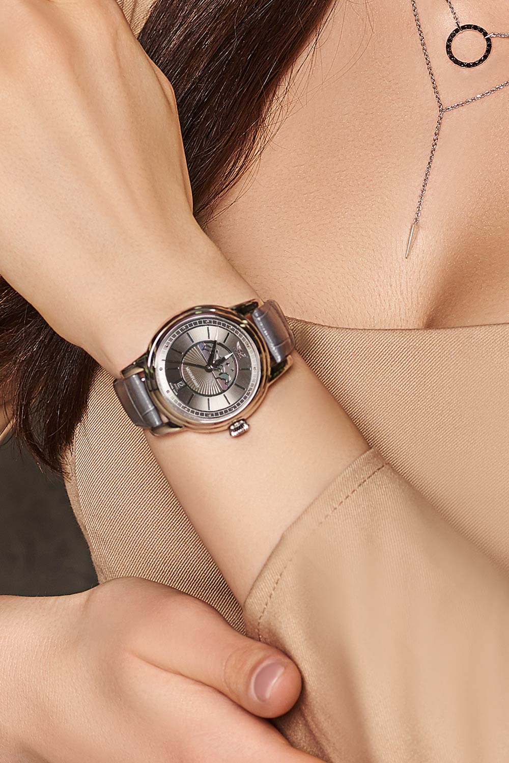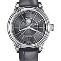Циферблат в стиле Art Deco украшает усложнение фаз Луны в верхней половине, обрамлённой тонким кольцом облаков. Отмечено окно даты в положении «6 часов». Стрелки и накладные метки обработаны люминесцентным покрытиемЛюминесцентное покрытиеПозволяет считывать показания времени в темноте. Производители наносят на стрелки, часовые индексы, безель или поверхность циферблата светонакопительный состав, дающий холодное свечение. Superluminova — для уверенного считывания в темноте. Поверхность защищена сапфировым стекломСапфировое стеклоПрочный и надёжный материал из кристалла сапфира синтетического происхождения, характеризующийся особой твёрдостью и устойчивостью к царапинам и повреждениям. с антибликовым покрытием.