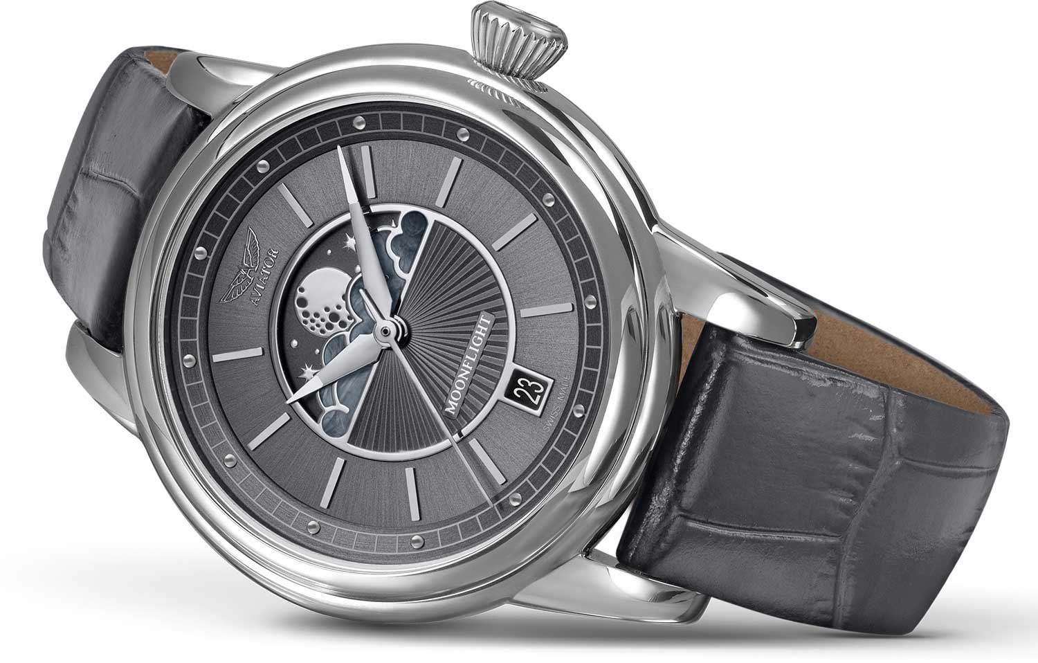 Aviator V.1.33.0.254.4 “Douglas Moonflight” — элегантный дамский швейцарский Moonphase с утончённой авиационной эстетикой. Корпус 36 мм из нержавеющей стали с полированной отделкой обладает компактными пропорциями и удобным литым профилем.