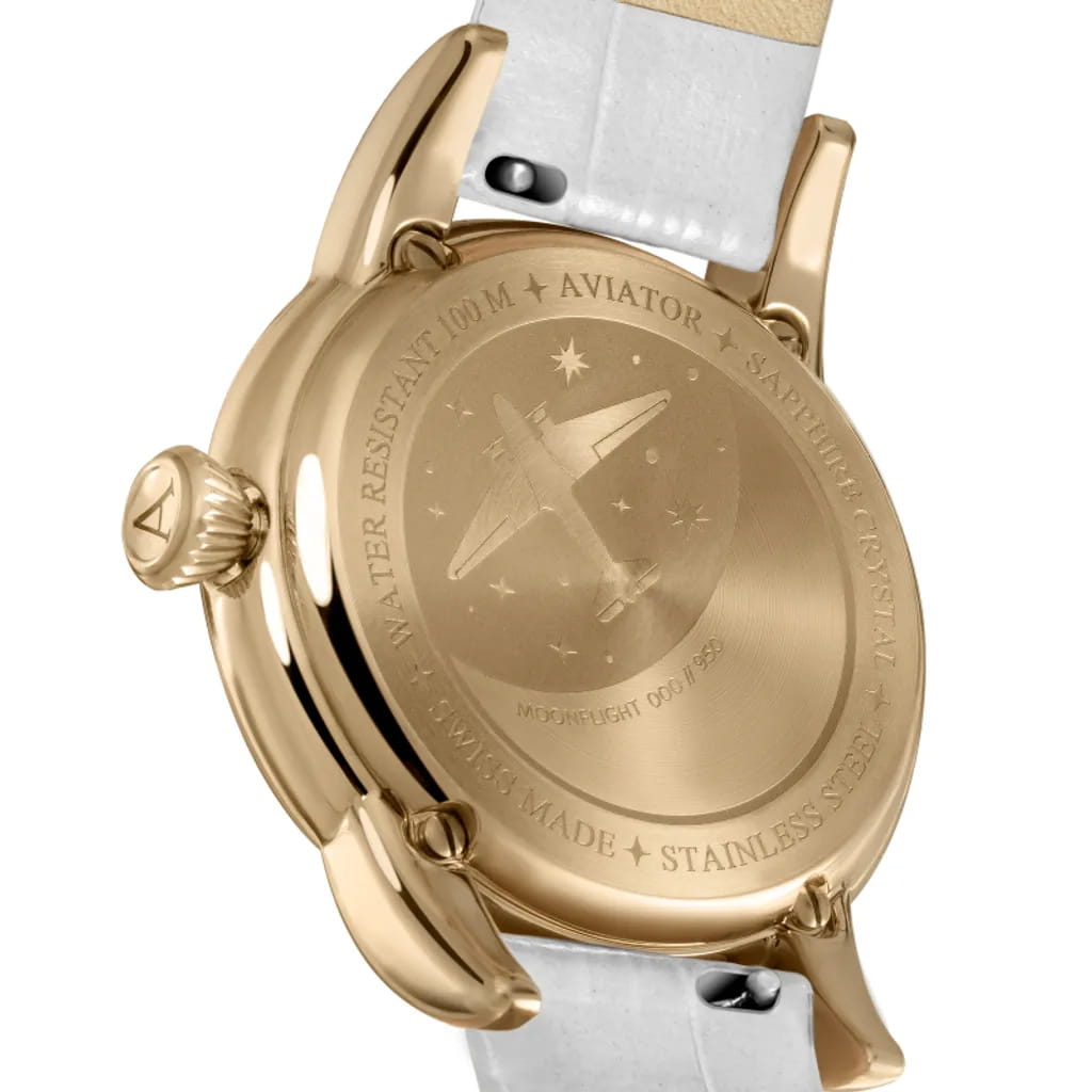 Aviator Douglas MoonFlight V.1.33.1.343.4 — элегантные дамские швейцарские часы с утончённой авиационной эстетикой. Корпус 36 мм из нержавеющей стали 316L с PVD-покрытиемPVDУльтратонкое покрытие наносится в технике вакуумного напыления, сочетает в себе нитрид титана особой прочности со слоем золота или оксида хрома. Несёт в себе декоративную или защитную функцию. обладает компактными пропорциями и удобным профилем. Циферблат в стиле Art Deco украшает усложнение фаз Луны в верхней половине, обрамлённой тонким кольцом облаков. Отмечено окно даты в положении «6 часов». Стрелки обработаны люминесцентным покрытиемЛюминесцентное покрытиеПозволяет считывать показания времени в темноте. Производители наносят на стрелки, часовые индексы, безель или поверхность циферблата светонакопительный состав, дающий холодное свечение. Superluminova — для уверенного считывания в темноте. Поверхность защищена сапфировым стекломСапфировое стеклоПрочный и надёжный материал из кристалла сапфира синтетического происхождения, характеризующийся особой твёрдостью и устойчивостью к царапинам и повреждениям. с антибликовым покрытиемАнтибликовое покрытиеСлой оксида металла в 0,13-0,3 микрон, благодаря которому стекло часов не бликует и не отражает свет. Антибликовое покрытие уменьшает отражение света в 10 раз, обеспечивая отличную читаемость показателей циферблата.. Сердце модели — швейцарский кварцевый механизм Ronda 708 с функцией отображения лунных фаз. Водозащита до 100 метров создают надёжную основу для эксплуатации. Кожаный ремень со стандартной застежкой сочетает в себе комфорт, элегантность и практичность. Aviator Douglas MoonFlight — это гармоничное сочетание авиационного наследия, женской элегантности и технической изысканности, воплощённое в элегантном и функциональном аксессуаре. Лимитированная серия.