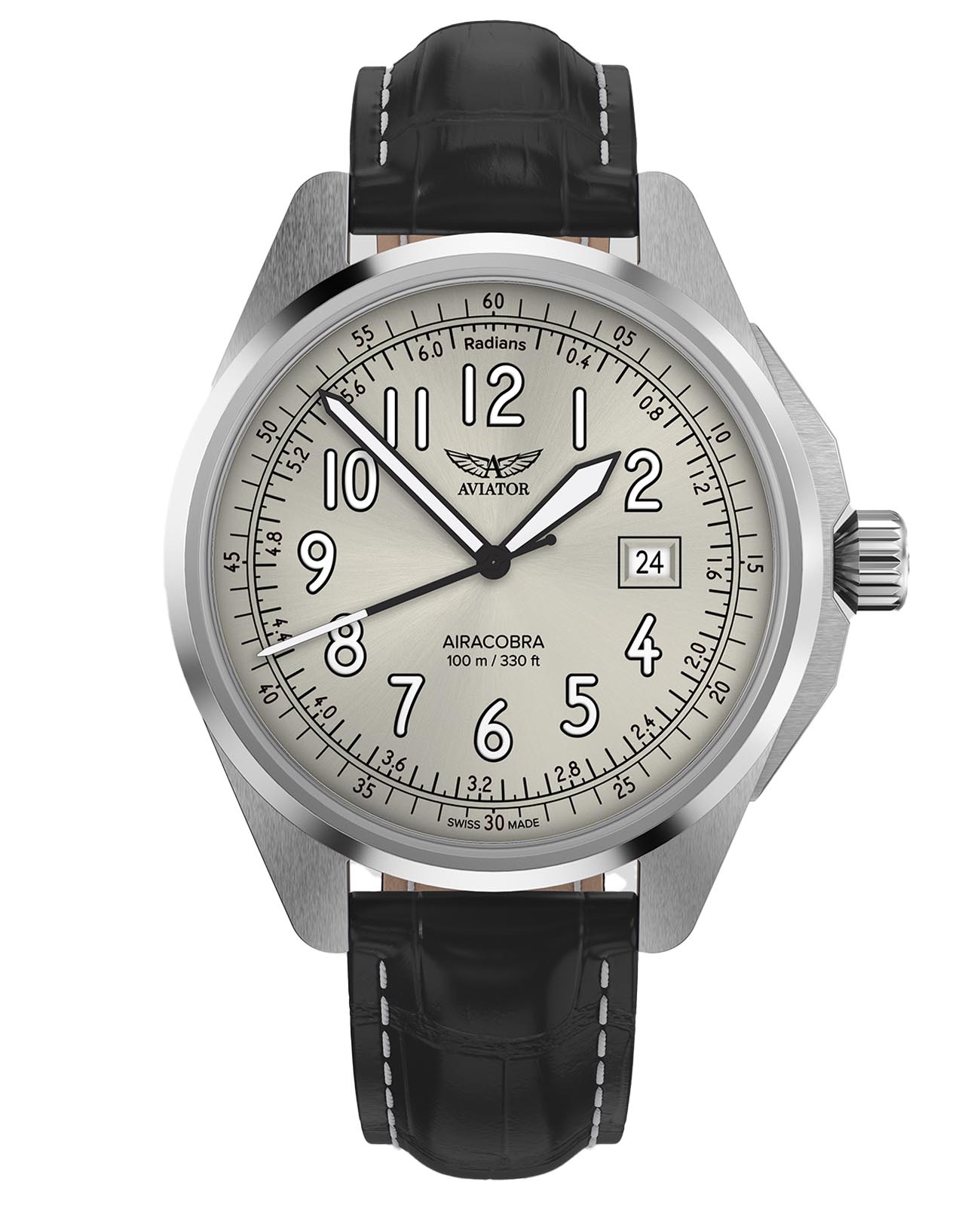 Aviator V.1.38.0.327.4 “Airacobra 43 Type A” — надёжные швейцарские пилотские часы с насыщенным функционалом и строгим авиационным дизайном. Корпус диаметром 42,8 мм выполнен из нержавеющей стали.