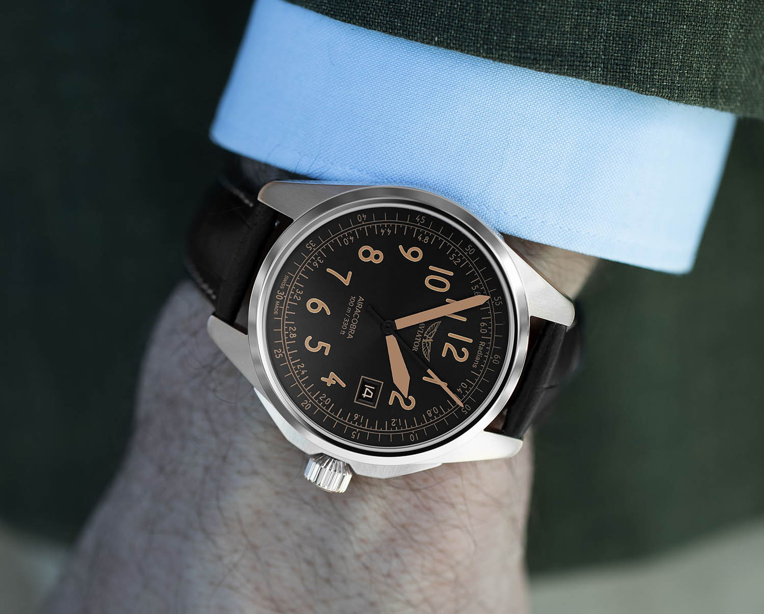 Aviator Airacobra 43 Type B V.1.38.2.323.4 — надёжные швейцарские пилотские часы с насыщенным функционалом и строгим авиационным дизайном. Корпус диаметром 42,8 мм выполнен из нержавеющей стали 316L с PVD-покрытиемPVDУльтратонкое покрытие наносится в технике вакуумного напыления, сочетает в себе нитрид титана особой прочности со слоем золота или оксида хрома. Несёт в себе декоративную или защитную функцию.. Циферблат имеет крупные арабские цифры и жёсткий контраст, соответствующий классическим пилотским образцам. Стрелки и метки покрыты люминесцентным покрытиемЛюминесцентное покрытиеПозволяет считывать показания времени в темноте. Производители наносят на стрелки, часовые индексы, безель или поверхность циферблата светонакопительный состав, дающий холодное свечение. Superluminova — это обеспечивает отличную читаемость в любых условиях. Окошко даты расположено у отметки «3 часа». На борту установлен швейцарский кварцевый механизм, способный с высокой точностью отображать время, дату. Циферблат защищён стойким сапфировым стекломСапфировое стеклоПрочный и надёжный материал из кристалла сапфира синтетического происхождения, характеризующийся особой твёрдостью и устойчивостью к царапинам и повреждениям. с антибликовым покрытиемАнтибликовое покрытиеСлой оксида металла в 0,13-0,3 микрон, благодаря которому стекло часов не бликует и не отражает свет. Антибликовое покрытие уменьшает отражение света в 10 раз, обеспечивая отличную читаемость показателей циферблата., завинчивающаяся заводная головка и задняя крышка обеспечивают уровень водозащиты до 100 метров. Кожаный ремень со стандартной застежкой обеспечивает удобство и надёжную фиксацию. Airacobra 43 Type B — инструментальные пилотские часы для тех, кто ценит надёжность, точность и удобную функциональность второго часового пояса в эстетике классических авиационных хронометров. Лимитированная серия.