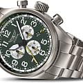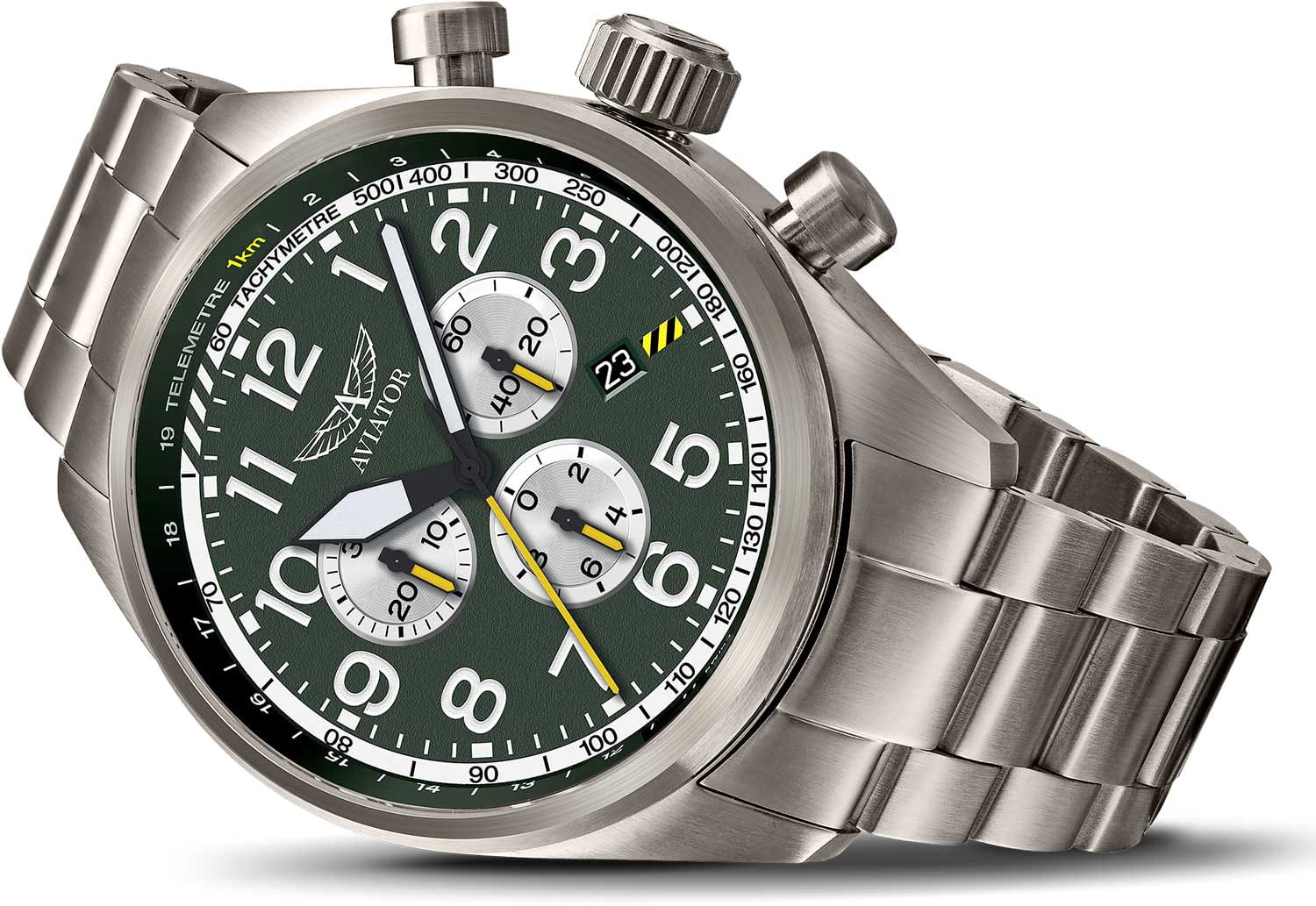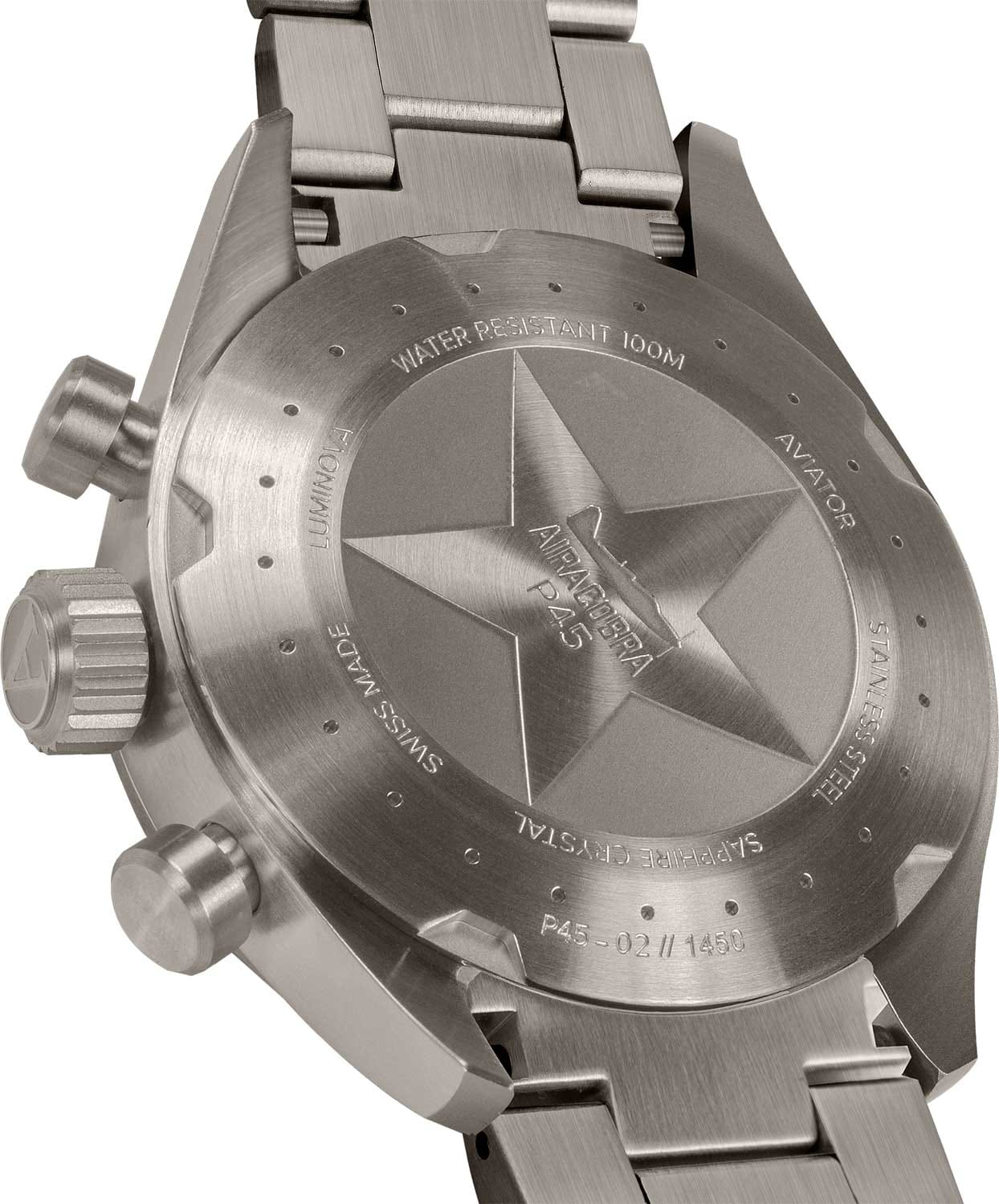 Aviator Airacobra P45 Chrono V.2.25.7.171.5 — швейцарские часы в духе пилотских инструментов, объединяющий точность, удобство и лаконичный дизайн. Диаметр корпуса — 45 мм, выполнен из нержавеющей стали 316L с PVD-покрытиемPVDУльтратонкое покрытие наносится в технике вакуумного напыления, сочетает в себе нитрид титана особой прочности со слоем золота или оксида хрома. Несёт в себе декоративную или защитную функцию. титанового цвета, что подчёркивает техническую надёжность в образе часов. Циферблат оформлен в классическом aviator-стиле: крупные арабские цифры, широкие стрелки и чёткое деление минут позволяют считывать время мгновенно. Стрелки и метки покрыты люминесцентным покрытиемЛюминесцентное покрытиеПозволяет считывать показания времени в темноте. Производители наносят на стрелки, часовые индексы, безель или поверхность циферблата светонакопительный состав, дающий холодное свечение. Superluminova для отличной читаемости при слабом освещении. Циферблат защищён стойким сапфировым стекломСапфировое стеклоПрочный и надёжный материал из кристалла сапфира синтетического происхождения, характеризующийся особой твёрдостью и устойчивостью к царапинам и повреждениям. с антибликовым покрытиемАнтибликовое покрытиеСлой оксида металла в 0,13-0,3 микрон, благодаря которому стекло часов не бликует и не отражает свет. Антибликовое покрытие уменьшает отражение света в 10 раз, обеспечивая отличную читаемость показателей циферблата.. У модели присутствуют дата и точный откидной механизм завинчивающейся заводной головки и задней крышки, обеспечивающий надёжную водозащиту до 100 м и защиту от ударов. Внутри установлен швейцарский кварцевый механизм, который обеспечивает функции хронографаХронографФункция позволяет измерять отрезки времени с особой точностью: часы, минуты, секунды. Верным признаком хронографа является наличие на циферблате 3 дополнительных окошек-счётчиков.. Функции добавить (ADD) и разделить (SPLIT). Часы комплектуются браслетом из нержавеющей стали с PVD-покрытиемPVDУльтратонкое покрытие наносится в технике вакуумного напыления, сочетает в себе нитрид титана особой прочности со слоем золота или оксида хрома. Несёт в себе декоративную или защитную функцию. титанового цвета с удобной раскладной застёжкойРаскладная застёжкаТакой тип застёжки используется только на браслетах из металла. Она никогда не раскрывается полностью, происходит разделение на 2 и более частей. Раскладывающая застёжка снизит вероятность потери часов к минимуму., обеспечивающей надёжную фиксацию и комфорт при ежедневной носке. Эти изысканные часы так же обладают функциями тахиметраТахиметрРазмеченная шкала, располагается на ободке или безеле часов. Тахиметр позволяет рассчитать скорость на определённом участке пути, расстояние измеряется в километрах или милях., секундомераСекундомерСекундоме́р — прибор, способный измерять интервалы времени с точностью до долей секунды. и телеметра. Airacobra — это практичный и стильный инструмент для путешествий и активной повседневности, объединяющий авиационную эстетику, точный механизм и удобство.