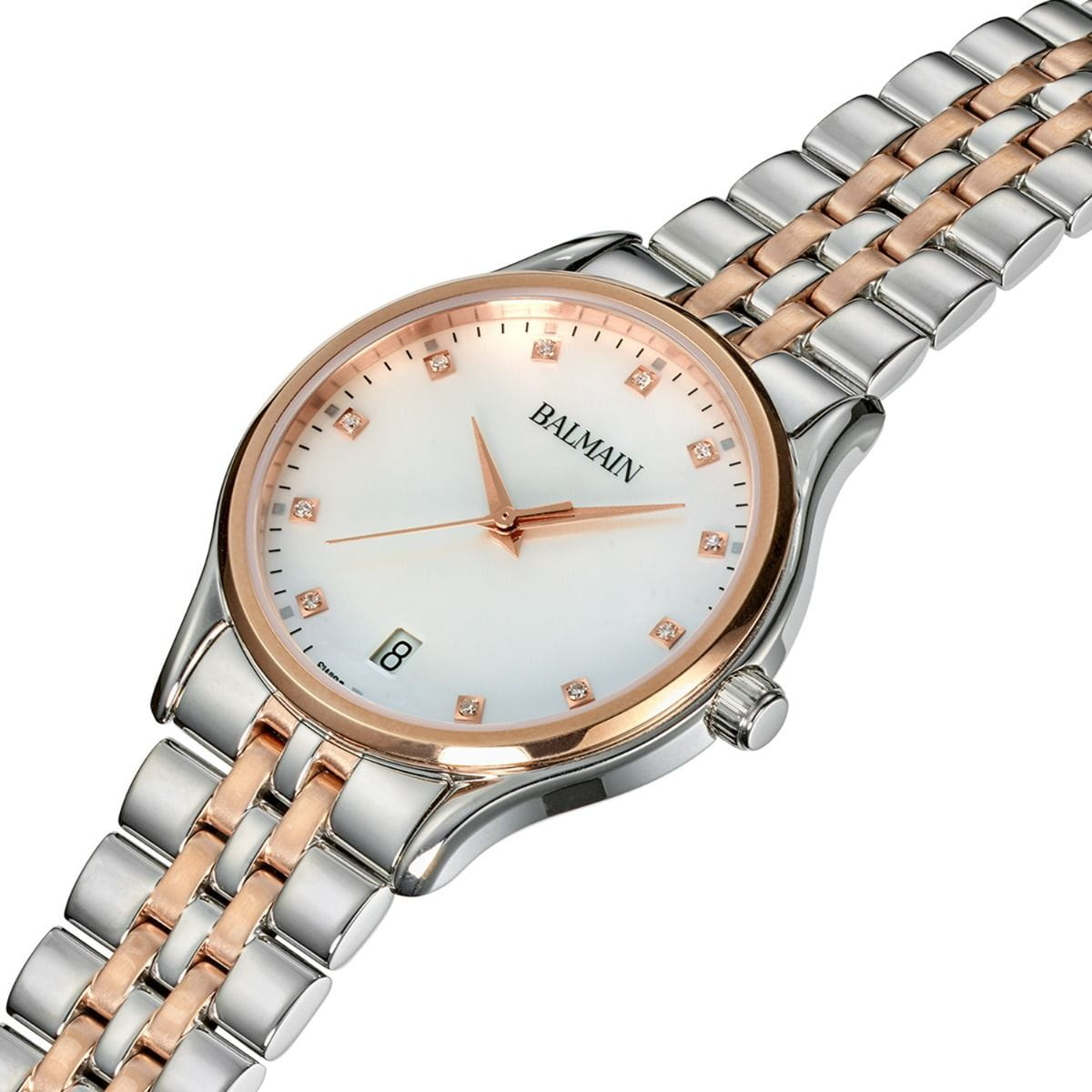 Женские часы Balmain Beleganza B8358.33.86 кварцевый механизм с высокой точностью. Сапфировое стеклоСапфировое стеклоПрочный и надёжный материал из кристалла сапфира синтетического происхождения, характеризующийся особой твёрдостью и устойчивостью к царапинам и повреждениям. устойчивое к появлению царапин, обладающее высокой прозрачностью. Корпус изготовлен из нержавеющей стали. Класс водозащиты: 50 метров, позволит защитить корпус от случайных брызг или капель дождя. Стальной браслет с частичным PVD-покрытиемPVDУльтратонкое покрытие наносится в технике вакуумного напыления, сочетает в себе нитрид титана особой прочности со слоем золота или оксида хрома. Несёт в себе декоративную или защитную функцию.. на застёжке «бабочка» с кнопкамиЗастёжка "бабочка"Такой вид застёжки дополняется предохранителями, помогающими избежать случайного раскрытия браслета. Обладают изящным исполнением. .. БезельБезельВнешний ободок, закрепляющий стекло. В спортивных часах так называется поворотное кольцо с делениями на циферблате, выполняет роль таймера – замеряет отрезки времени на шкале. Неподвижный безель – элемент декора. Однонаправленно вращающийся безель на дайверских часах позволяет фиксировать моменты погружения и выныривания на поверхность. с PVD-покрытиемPVDУльтратонкое покрытие наносится в технике вакуумного напыления, сочетает в себе нитрид титана особой прочности со слоем золота или оксида хрома. Несёт в себе декоративную или защитную функцию.. Окошко даты находится в положении 6 часов.