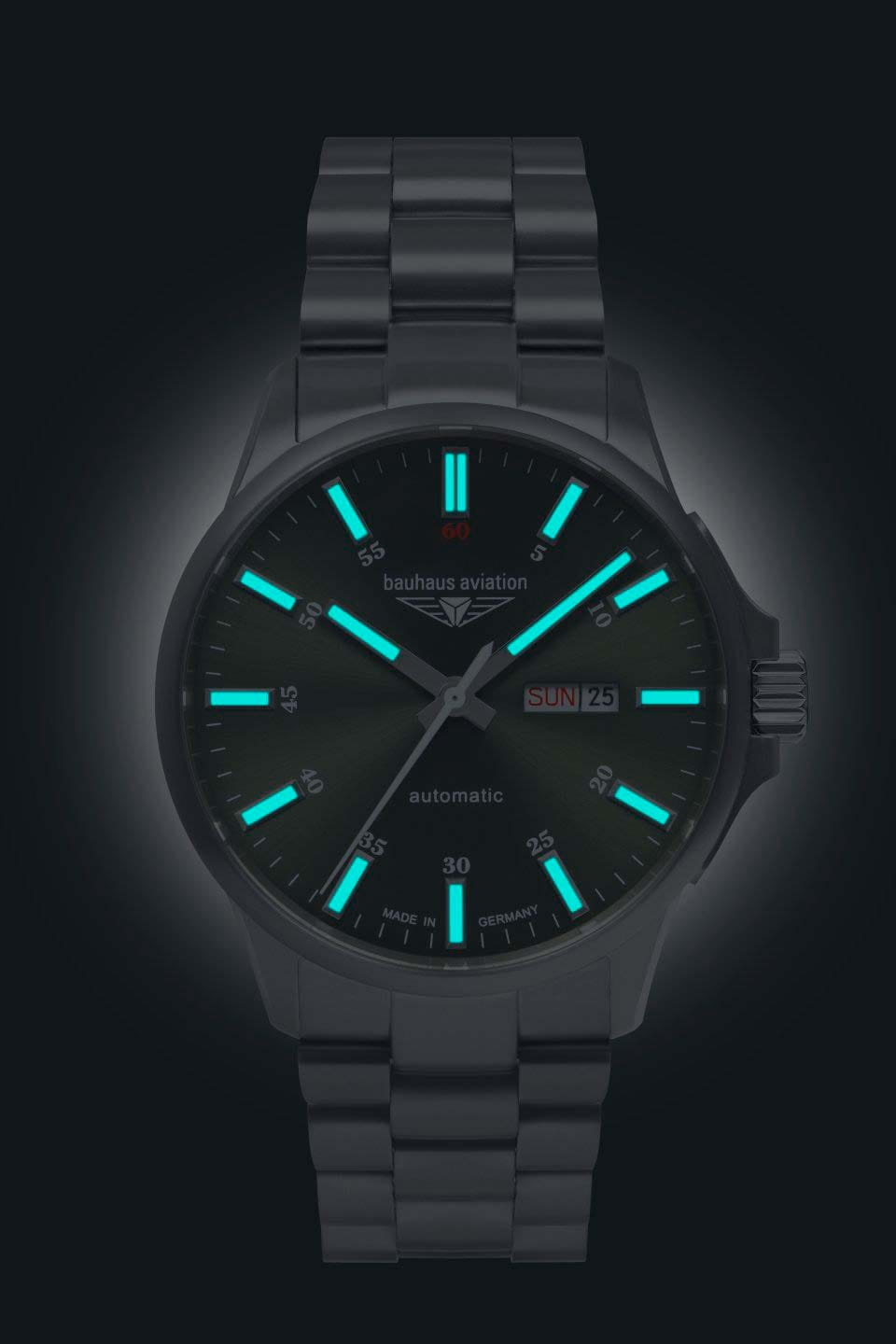 Мужские механические часы с автоподзаводом Bauhaus — это функциональный аксессуар, вдохновлённый авиационными хронометрами. Корпус диаметром 42 мм и толщиной 13 мм выполнен из титана. Циферблат зелёного цвета выполнен по технологии Sunray («солнечные лучи») и оформлен штрихами и прямоугольными стрелками в стиле Baton. Окошки даты и дня недели расположены в положении 3 часов. Стрелки и метки с люминесцентным покрытиемЛюминесцентное покрытиеПозволяет считывать показания времени в темноте. Производители наносят на стрелки, часовые индексы, безель или поверхность циферблата светонакопительный состав, дающий холодное свечение., обеспечивающим хорошую читаемость в темноте. Циферблат защищён сапфировым стекломСапфировое стеклоПрочный и надёжный материал из кристалла сапфира синтетического происхождения, характеризующийся особой твёрдостью и устойчивостью к царапинам и повреждениям.. Механизм — автоматический калибр Miyota 8205 (21 камень). Рифлёная заводная головка с защитой обеспечивает надёжную настройку времени. Завинчивающаяся прозрачная задняя крышка позволяет наблюдать за работой механизма и повышает водонепроницаемость. Часы оснащены титановым браслетом на раскладной застёжкеРаскладная застёжкаТакой тип застёжки используется только на браслетах из металла. Она никогда не раскрывается полностью, происходит разделение на 2 и более частей. Раскладывающая застёжка снизит вероятность потери часов к минимуму.. Водонепроницаемость 100 м позволяет использовать часы для плавания и повседневного ношения. Идеальный выбор для тех, кто ценит немецкое качество, лёгкость и спортивный дизайн.