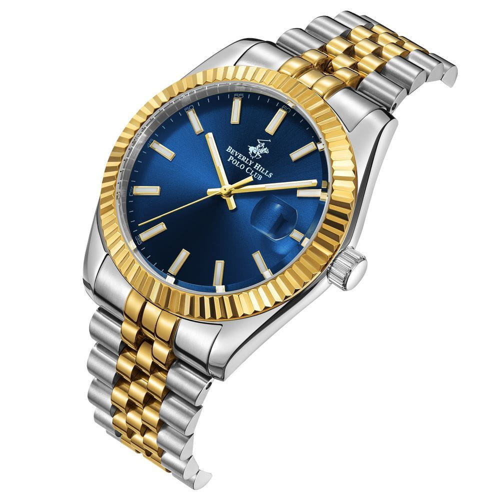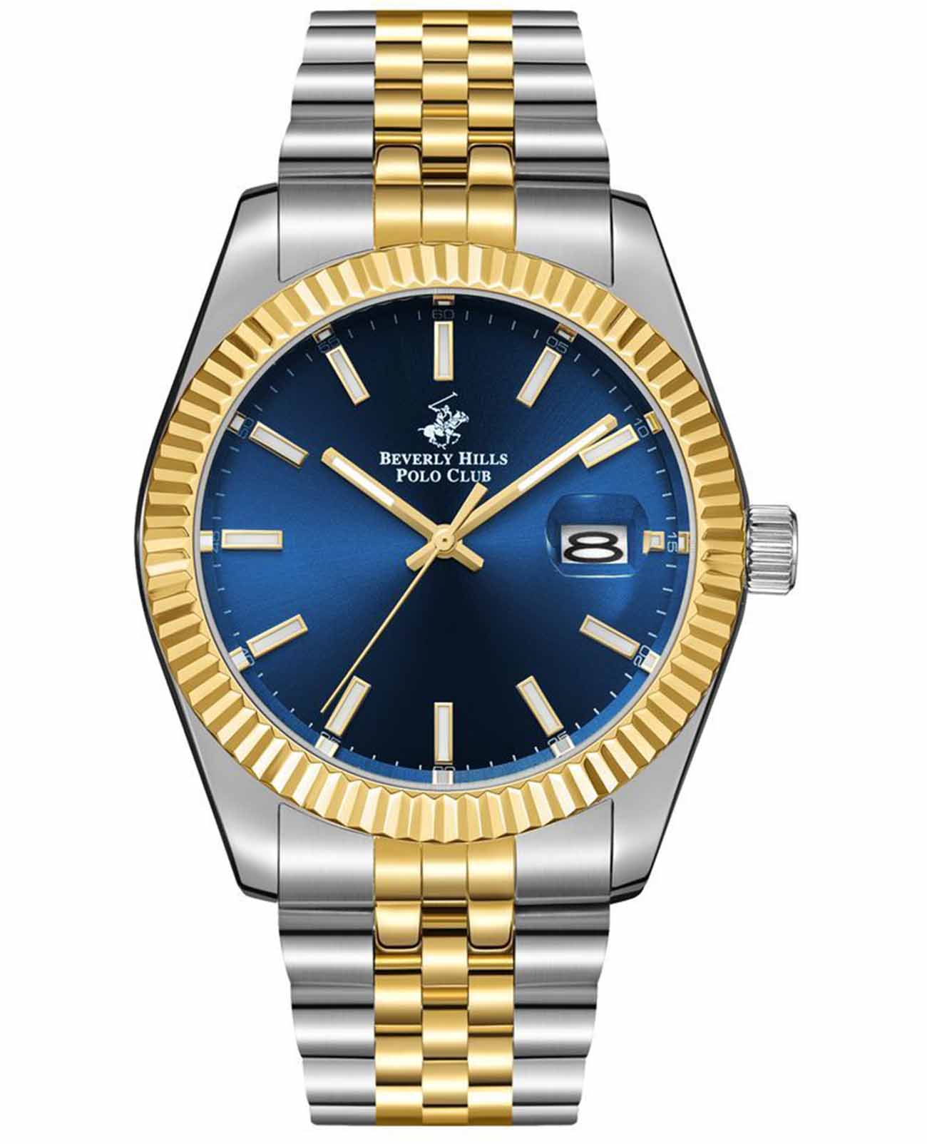 Beverly Hills Polo Club BP3018X.290 — элегантная и универсальная модель, сочетающая сдержанный стиль и надёжность повседневного использования. Корпус диаметром 41 мм выполнен из нержавеющей стали и безельБезельВнешний ободок, закрепляющий стекло. В спортивных часах так называется поворотное кольцо с делениями на циферблате, выполняет роль таймера – замеряет отрезки времени на шкале. Неподвижный безель – элемент декора. Однонаправленно вращающийся безель на дайверских часах позволяет фиксировать моменты погружения и выныривания на поверхность. с PVD-покрытиемPVDУльтратонкое покрытие наносится в технике вакуумного напыления, сочетает в себе нитрид титана особой прочности со слоем золота или оксида хрома. Несёт в себе декоративную или защитную функцию., придающим изделию благородный двухцветный блеск.