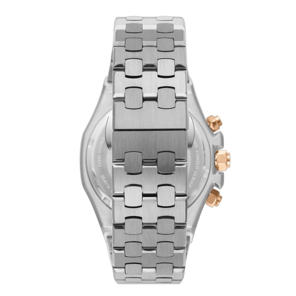 Браслет из стали завершён застёжкой-бабочкой с кнопкамиЗастёжка "бабочка"Такой вид застёжки дополняется предохранителями, помогающими избежать случайного раскрытия браслета. Обладают изящным исполнением. — с кнопочным механизмом для удобного снятия. Водозащита до 50 м удовлетворит потребности как делового, так и активного образа жизни  .