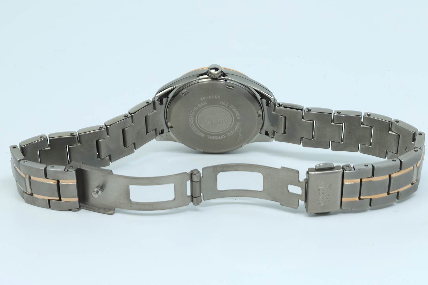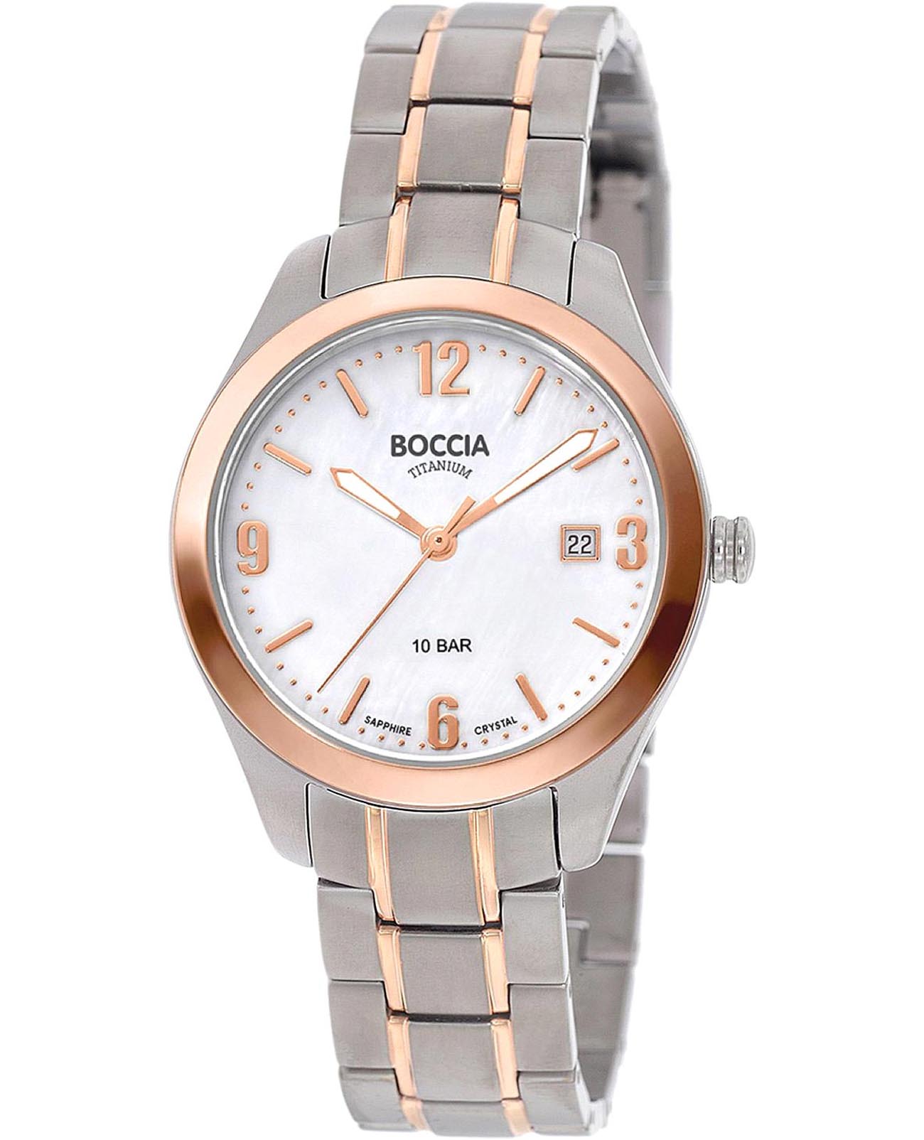 Женские наручные часы Boccia Titanium 3317-02 с надёжным кварцевым механизмом. Корпус и браслет часов изготовлены из титана. Сапфировое стеклоСапфировое стеклоПрочный и надёжный материал из кристалла сапфира синтетического происхождения, характеризующийся особой твёрдостью и устойчивостью к царапинам и повреждениям. устойчивое к мелким механическим повреждениям. Класс водозащиты: 100 метров, позволит плавать, нырять и заниматься другими водными видами спорта. Титановый браслет с частичным PVD-покрытиемPVDУльтратонкое покрытие наносится в технике вакуумного напыления, сочетает в себе нитрид титана особой прочности со слоем золота или оксида хрома. Несёт в себе декоративную или защитную функцию. на раскладной застёжкеРаскладная застёжкаТакой тип застёжки используется только на браслетах из металла. Она никогда не раскрывается полностью, происходит разделение на 2 и более частей. Раскладывающая застёжка снизит вероятность потери часов к минимуму.. Окошко даты находится в положении 3 часа. Стрелки с люминесцентным покрытиемЛюминесцентное покрытиеПозволяет считывать показания времени в темноте. Производители наносят на стрелки, часовые индексы, безель или поверхность циферблата светонакопительный состав, дающий холодное свечение..