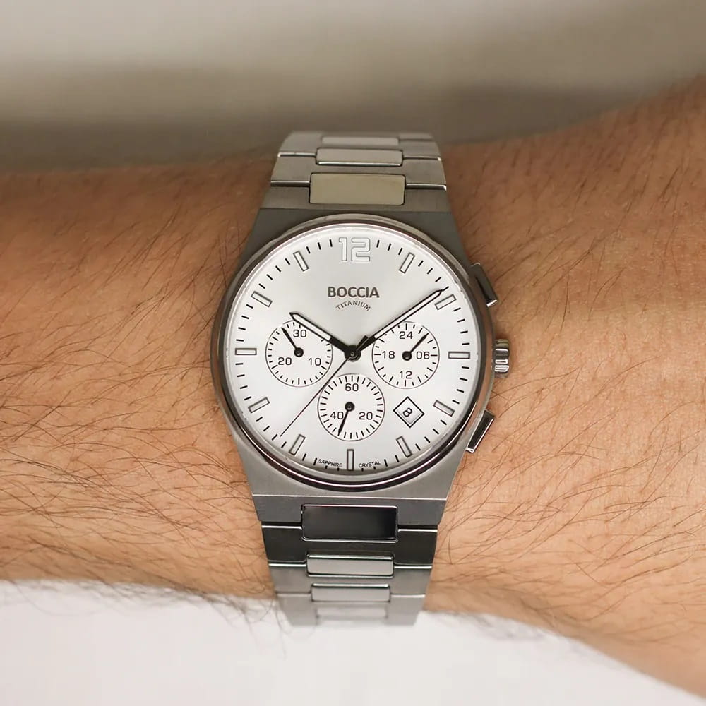 Мужские немецкие титановые часы-хронографХронографФункция позволяет измерять отрезки времени с особой точностью: часы, минуты, секунды. Верным признаком хронографа является наличие на циферблате 3 дополнительных окошек-счётчиков. Boccia Titanium 3741-01, кварцевый механизм с высокой точностью. Сапфировое стеклоСапфировое стеклоПрочный и надёжный материал из кристалла сапфира синтетического происхождения, характеризующийся особой твёрдостью и устойчивостью к царапинам и повреждениям. устойчивое к мелким механическим повреждениям. Корпус изготовлен из титана. На цифрблате расположены три дополнительных индикатора и окошко даты. Стрелки и метки с люминесцентным покрытиемЛюминесцентное покрытиеПозволяет считывать показания времени в темноте. Производители наносят на стрелки, часовые индексы, безель или поверхность циферблата светонакопительный состав, дающий холодное свечение.. Класс водозащиты: 50 метров, позволит защитить корпус от случайных брызг или капель дождя. Браслет из титана на раскладной застёжкеРаскладная застёжкаТакой тип застёжки используется только на браслетах из металла. Она никогда не раскрывается полностью, происходит разделение на 2 и более частей. Раскладывающая застёжка снизит вероятность потери часов к минимуму..