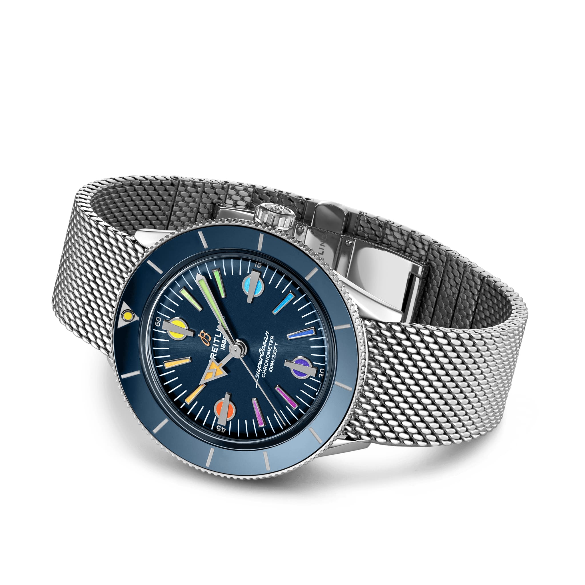 Эта яркая модель представлена лимитированной серией из 1000 экземпляров. Как и оригинальные SuperOcean, новые часы имеют две характерные особенности: на 42-миллиметровом корпусе из нержавеющей стали установлен вращающийся в оба направления вогнутый керамический безель, а на циферблате выделяются крупные метки.