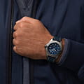 Класс водозащиты: 300 метров, позволит плавать, нырять и заниматься другими водными видами спорта. Корпус часов изготовлен из нержавеющей стали, серебристого цвета. Синий ремешок из телячьей кожи с кнопочной застежкой.