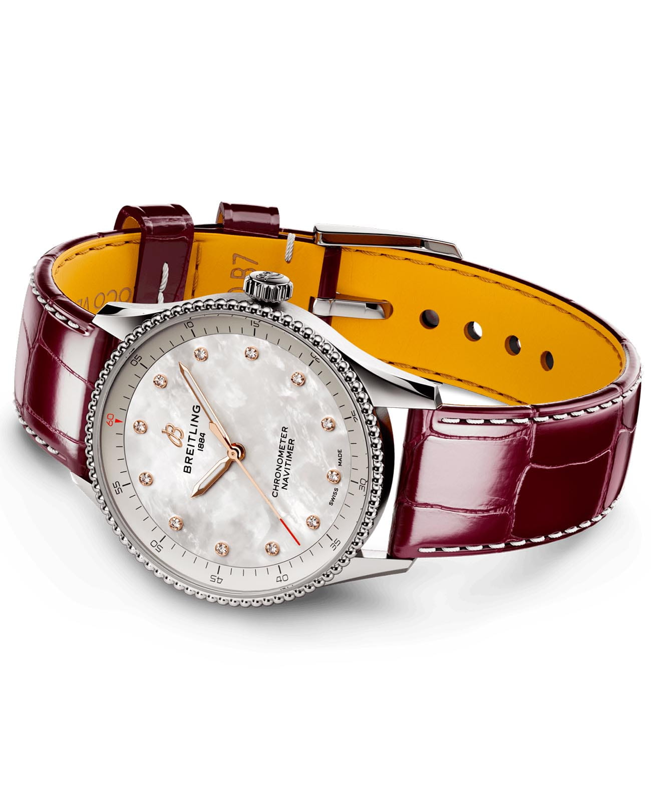 Швейцарские унисекс часы-хронометр Breitling Navitimer Automatic 36 A77320E61A2P2, механический механизм (автоматический калибр) с высокой точностью. Сапфировое стеклоСапфировое стеклоПрочный и надёжный материал из кристалла сапфира синтетического происхождения, характеризующийся особой твёрдостью и устойчивостью к царапинам и повреждениям. устойчивое к появлению царапин, обладающее высокой прозрачностью. Класс водозащиты: 50 метров, позволит защитить корпус от случайных брызг или капель дождя. Корпус часов изготовлен из нержавеющей стали. Ремешок из кожи аллигатора с раскладной застёжкойРаскладная застёжкаТакой тип застёжки используется только на браслетах из металла. Она никогда не раскрывается полностью, происходит разделение на 2 и более частей. Раскладывающая застёжка снизит вероятность потери часов к минимуму.. Стрелки с люминесцентным покрытиемЛюминесцентное покрытиеПозволяет считывать показания времени в темноте. Производители наносят на стрелки, часовые индексы, безель или поверхность циферблата светонакопительный состав, дающий холодное свечение.. Циферблат инкрустирован бриллантами.