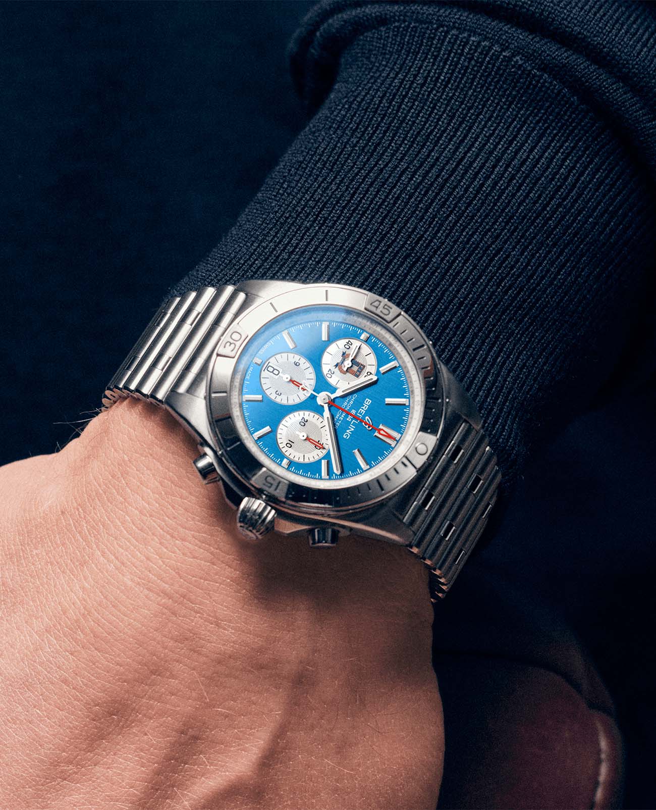 Мужские швейцарские часы-хронограф с секундомером Breitling Chronomat B01 42 Six Nations Italy AB0134A41C1A1, механический механизм (автоматический калибр) с высокой точностью. Сапфировое стеклоСапфировое стеклоПрочный и надёжный материал из кристалла сапфира синтетического происхождения, характеризующийся особой твёрдостью и устойчивостью к царапинам и повреждениям. устойчивое к появлению царапин, обладающее высокой прозрачностью. Класс водозащиты: 200 метров, позволит плавать, нырять и заниматься другими водными видами спорта. Корпус часов изготовлен из нержавеющей стали. Стальной браслет на застёжке «бабочка» с кнопкамиЗастёжка "бабочка"Такой вид застёжки дополняется предохранителями, помогающими избежать случайного раскрытия браслета. Обладают изящным исполнением. . Стрелки и метки с люминесцентным покрытиемЛюминесцентное покрытиеПозволяет считывать показания времени в темноте. Производители наносят на стрелки, часовые индексы, безель или поверхность циферблата светонакопительный состав, дающий холодное свечение.. Шкала тахиметра на циферблате. Окошко даты находится в положении 6 часов.