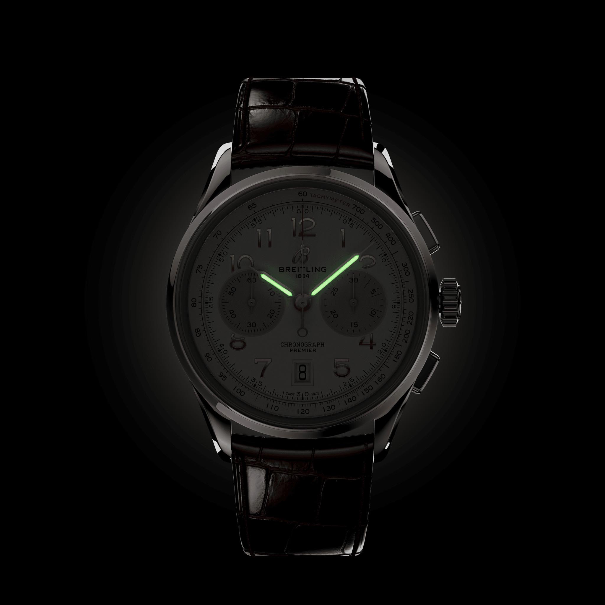 Мужские швейцарские часы-хронографХронографФункция позволяет измерять отрезки времени с особой точностью: часы, минуты, секунды. Верным признаком хронографа является наличие на циферблате 3 дополнительных окошек-счётчиков. с тахиметромТахиметрРазмеченная шкала, располагается на ободке или безеле часов. Тахиметр позволяет рассчитать скорость на определённом участке пути, расстояние измеряется в километрах или милях. Breitling Premier B01 Chronograph 42 AB0145211G1P1, механический механизм (автоматический калибр) с высокой точностью. Сапфировое стеклоСапфировое стеклоПрочный и надёжный материал из кристалла сапфира синтетического происхождения, характеризующийся особой твёрдостью и устойчивостью к царапинам и повреждениям. с антибликовым покрытием устойчивое к появлению царапин, обладающее высокой прозрачностью. Класс водозащиты: 100 метров, позволит плавать, нырять и заниматься другими водными видами спорта. Корпус часов изготовлен из стали. Кожаный крокодиловый ремешок с раскладной застёжкойРаскладная застёжкаТакой тип застёжки используется только на браслетах из металла. Она никогда не раскрывается полностью, происходит разделение на 2 и более частей. Раскладывающая застёжка снизит вероятность потери часов к минимуму.. Стрелки с люминесцентным покрытиемЛюминесцентное покрытиеПозволяет считывать показания времени в темноте. Производители наносят на стрелки, часовые индексы, безель или поверхность циферблата светонакопительный состав, дающий холодное свечение.. Окошко даты находится в положении 6 часов. СекундомерСекундомерСекундоме́р — прибор, способный измерять интервалы времени с точностью до долей секунды..