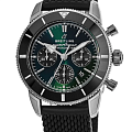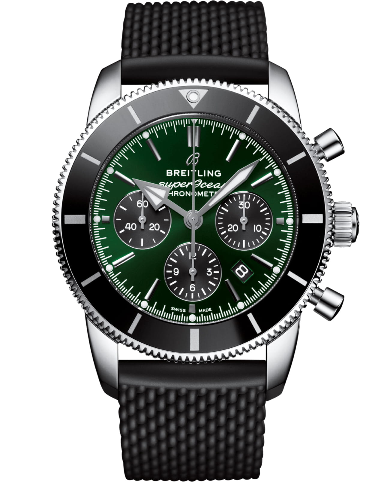 Вдохновленный оригинальным Superocean 1950-х годов, Superocean Heritage сочетает в себе культовые черты дизайна с современными нотками. Спортивный и элегантный Superocean Heritage является истинным воплощением морского стиля. Мужские швейцарские часы с хронографом Breitling Superocean Heritage B01 Chronograph 44 Limited Edition AB01621A1L1S1, механический механизм (автоматический калибр) с высокой точностью. Сапфировое стеклоСапфировое стеклоПрочный и надёжный материал из кристалла сапфира синтетического происхождения, характеризующийся особой твёрдостью и устойчивостью к царапинам и повреждениям. устойчивое к появлению царапин, обладающее высокой прозрачностью. Класс водозащиты: 200 метров, позволит плавать, нырять и заниматься другими водными видами спорта. Корпус часов изготовлен из стали. Коллекция Superocean Heritage с черным циферблатом зеленого цвета выпущена ограниченным тиражом в 500 экземпляров. Часы Superocean Heritage, оснащенные культовыми стрелками треугольной формы, а также однонаправленным безелемБезельВнешний ободок, закрепляющий стекло. В спортивных часах так называется поворотное кольцо с делениями на циферблате, выполняет роль таймера – замеряет отрезки времени на шкале. Неподвижный безель – элемент декора. Однонаправленно вращающийся безель на дайверских часах позволяет фиксировать моменты погружения и выныривания на поверхность. с полированным керамическим кольцом, представляют собой элегантные часы для дайверов. Часы оснащены хронометром калибра 01 собственной мануфактуры Breitling, сертифицированным COSCСертификат COSCОфициальный сертификат, подтверждающий то, что часы ходят с особо высокой точностью. Для получения документа часы подвергаются тестовым испытаниям, разработанным швейцарским институтом тестирования хронометров COSC. Допустимая норма для механических часов -4/+6 секунд в день, для кварцевых моделей +/- 0,07 секунд в день..