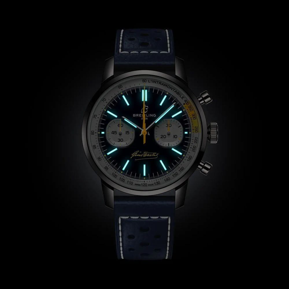 Breitling Top Time B01 Gino Bartali AB01767A1C1X1 — лимитированная модель, объединяющая дух велоспорта, винтажный стиль и высокоточную механику. Корпус диаметром 41 мм выполнен из нержавеющей стали с полированной отделкой. Прозрачная задняя крышка украшена гравировкой «Gino Bartali Tribute» и пометкой «One of 750», подчёркивающей эксклюзивность выпуска. Циферблат защищён сапфировым стекломСапфировое стеклоПрочный и надёжный материал из кристалла сапфира синтетического происхождения, характеризующийся особой твёрдостью и устойчивостью к царапинам и повреждениям. с антибликовым покрытиемАнтибликовое покрытиеСлой оксида металла в 0,13-0,3 микрон, благодаря которому стекло часов не бликует и не отражает свет. Антибликовое покрытие уменьшает отражение света в 10 раз, обеспечивая отличную читаемость показателей циферблата.. Синий матовый циферблат выполнен в стиле би-компакс с двумя белыми субциферблатами. На внешней шкале расположена надпись «L'Intramontabile», а на отметке «6 часов» — подпись Джино Бартали. Внутри установлен автоматический швейцарский хронографХронографФункция позволяет измерять отрезки времени с особой точностью: часы, минуты, секунды. Верным признаком хронографа является наличие на циферблате 3 дополнительных окошек-счётчиков. калибра Breitling B01 без даты, с запасом хода до 70 часов. Механизм сертифицирован по стандарту COSCСертификат COSCОфициальный сертификат, подтверждающий то, что часы ходят с особо высокой точностью. Для получения документа часы подвергаются тестовым испытаниям, разработанным швейцарским институтом тестирования хронометров COSC. Допустимая норма для механических часов -4/+6 секунд в день, для кварцевых моделей +/- 0,07 секунд в день., что гарантирует высокую точность. Модель комплектуется перфорированным кожаным ремешком синего цвета с раскладной застёжкойРаскладная застёжкаТакой тип застёжки используется только на браслетах из металла. Она никогда не раскрывается полностью, происходит разделение на 2 и более частей. Раскладывающая застёжка снизит вероятность потери часов к минимуму., обеспечивающей надёжную и комфортную посадку. Водонепроницаемость 100 метров делает часы надёжными спутниками в активной жизни. Идеальный выбор для тех, кто ценит историческое наследие, эстетику 60-х и современное исполнение.