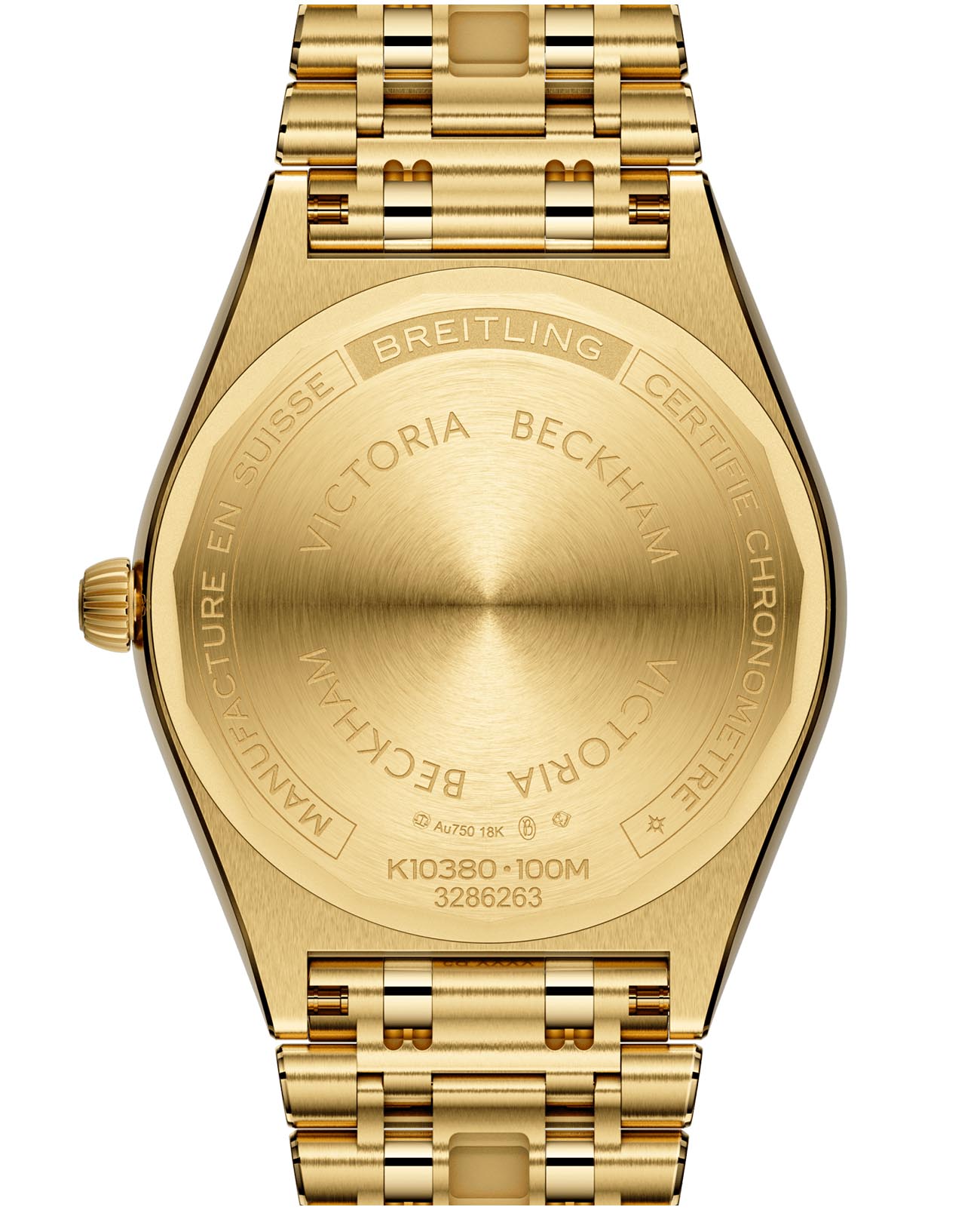 Женские швейцарские часы Breitling Chronomat Automatic 36 Victoria Beckham K103801A1C1K1 с надёжным автоматическим механизмом, выпущенные лимитированной серией всего из 1500 экземпляров в сотрудничестве с модным домом Victoria Beckham. Сапфировое стеклоСапфировое стеклоПрочный и надёжный материал из кристалла сапфира синтетического происхождения, характеризующийся особой твёрдостью и устойчивостью к царапинам и повреждениям. устойчивое к мелким механическим повреждениям. Корпус и браслет часов изготовлены из желтого 18-каратного золота18-каратное золотоОбозначение по каратной системе пробирования, оно показывает, сколько драгоценного металла содержится в изделии. 18 карат - в составе 75% чистого золота, соответствует 750 пробе.