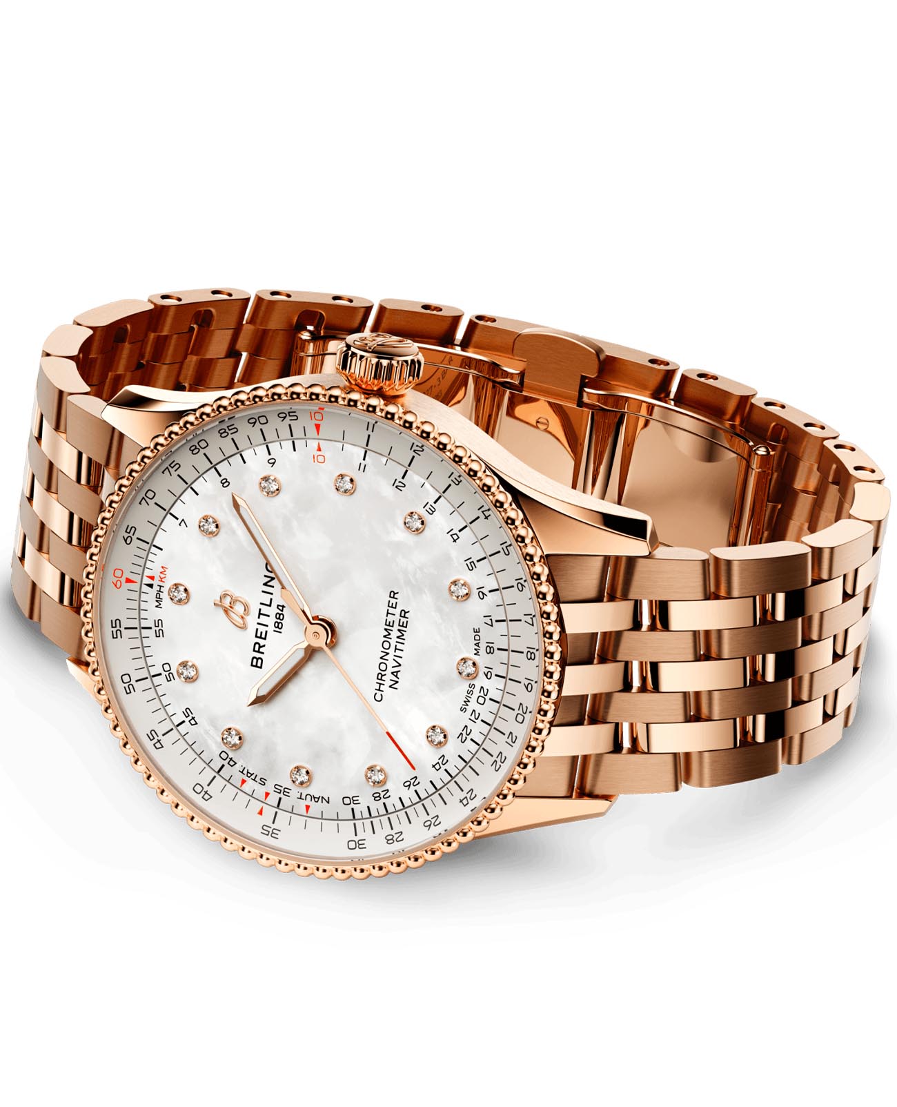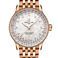 Швейцарские унисекс часы-хронометр Breitling Navitimer Automatic 36 R17327211A1R1, механический механизм (автоматический калибр) с высокой точностью. Сапфировое стеклоСапфировое стеклоПрочный и надёжный материал из кристалла сапфира синтетического происхождения, характеризующийся особой твёрдостью и устойчивостью к царапинам и повреждениям. устойчивое к появлению царапин, обладающее высокой прозрачностью. Класс водозащиты: 30 метров, позволит защитить корпус от случайных брызг или капель дождя. Корпус и браслет часов изготовлены из красного 18-каратного золота18-каратное золотоОбозначение по каратной системе пробирования, оно показывает, сколько драгоценного металла содержится в изделии. 18 карат - в составе 75% чистого золота, соответствует 750 пробе.