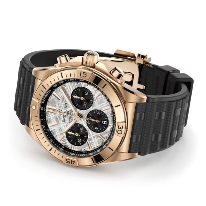 Универсальный хронометр Breitling Chronomat B01 42 Erling Haaland RB01347A1F1S1 выпущен ограниченным тиражом в 250 экземпляров в сотрудничестве с самим футболистом. Циферблат с черными дополнительными циферблатами вырезан из метеорита Муониалюста возрастом 4,5 миллиарда лет. На противовесе секундной стрелки хронографа выгравированы инициалы Эрлинга. Часы-хронографХронографФункция позволяет измерять отрезки времени с особой точностью: часы, минуты, секунды. Верным признаком хронографа является наличие на циферблате 3 дополнительных окошек-счётчиков. с секундомером и механическим механизмом (автоматический калибр) с высокой точностью. Циферблат защищен сапфировым стекломСапфировое стеклоПрочный и надёжный материал из кристалла сапфира синтетического происхождения, характеризующийся особой твёрдостью и устойчивостью к царапинам и повреждениям. с двусторонним антибликовым покрытиемАнтибликовое покрытиеСлой оксида металла в 0,13-0,3 микрон, благодаря которому стекло часов не бликует и не отражает свет. Антибликовое покрытие уменьшает отражение света в 10 раз, обеспечивая отличную читаемость показателей циферблата., устойчивым к повреждениям, а также дополнен безелемБезельВнешний ободок, закрепляющий стекло. В спортивных часах так называется поворотное кольцо с делениями на циферблате, выполняет роль таймера – замеряет отрезки времени на шкале. Неподвижный безель – элемент декора. Однонаправленно вращающийся безель на дайверских часах позволяет фиксировать моменты погружения и выныривания на поверхность.. Класс водозащиты: 200 метров позволит плавать, нырять и заниматься другими водными видами спорта. Корпус часов изготовлен из 18-каратного золота18-каратное золотоОбозначение по каратной системе пробирования, оно показывает, сколько драгоценного металла содержится в изделии. 18 карат - в составе 75% чистого золота, соответствует 750 пробе.