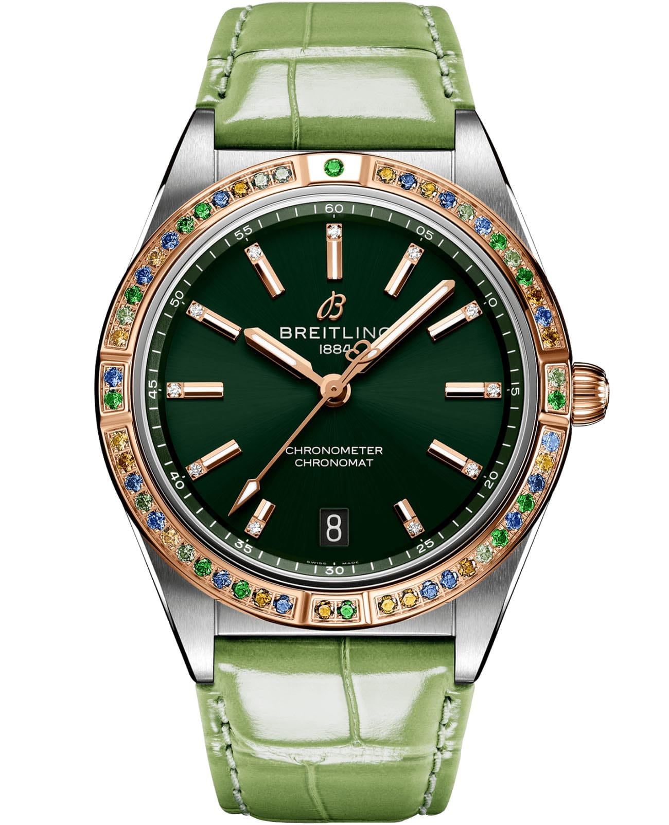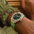 и циферблат инкрустированы бриллиантами. Ремешок из кожи аллигатора с раскладной застёжкойРаскладная застёжкаТакой тип застёжки используется только на браслетах из металла. Она никогда не раскрывается полностью, происходит разделение на 2 и более частей. Раскладывающая застёжка снизит вероятность потери часов к минимуму.. Стрелки и метки с люминесцентным покрытиемЛюминесцентное покрытиеПозволяет считывать показания времени в темноте. Производители наносят на стрелки, часовые индексы, безель или поверхность циферблата светонакопительный состав, дающий холодное свечение.. Класс водозащиты: 100 метров, позволит плавать, нырять и заниматься другими водными видами спорта.