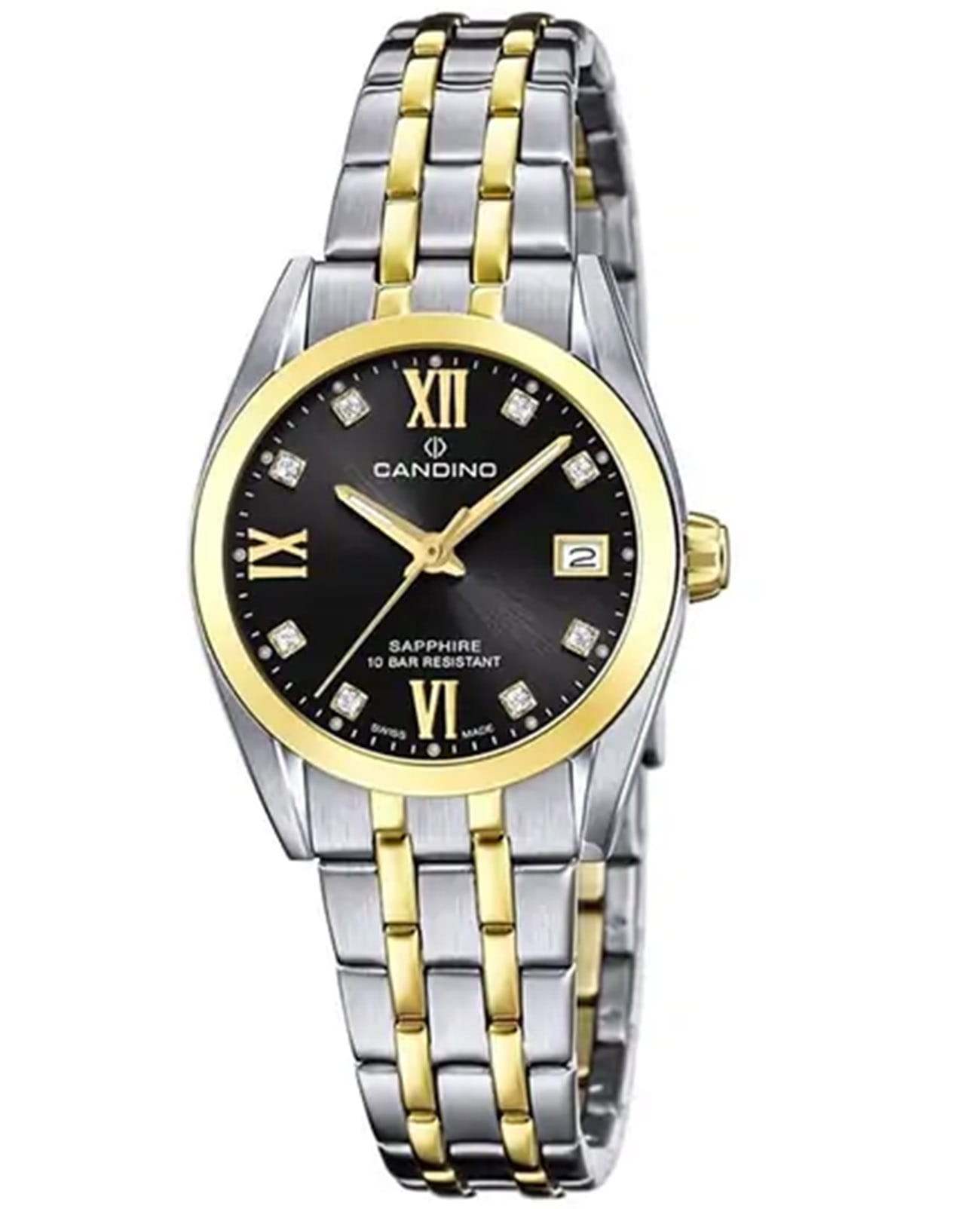 Женские швейцарские часы с сапфировым стекломСапфировое стеклоПрочный и надёжный материал из кристалла сапфира синтетического происхождения, характеризующийся особой твёрдостью и устойчивостью к царапинам и повреждениям. Candino Couple Quartz C4704/D, кварцевый механизм с высокой точностью. Сапфировое стеклоСапфировое стеклоПрочный и надёжный материал из кристалла сапфира синтетического происхождения, характеризующийся особой твёрдостью и устойчивостью к царапинам и повреждениям. устойчивое к появлению царапин, обладающее высокой прозрачностью. Класс водозащиты: 100 метров, позволит плавать, нырять и заниматься другими водными видами спорта. Корпус часов изготовлен из стали с PVD-покрытиемPVDУльтратонкое покрытие наносится в технике вакуумного напыления, сочетает в себе нитрид титана особой прочности со слоем золота или оксида хрома. Несёт в себе декоративную или защитную функцию.. Браслет с раскладной застёжкойРаскладная застёжкаТакой тип застёжки используется только на браслетах из металла. Она никогда не раскрывается полностью, происходит разделение на 2 и более частей. Раскладывающая застёжка снизит вероятность потери часов к минимуму.. Стрелки с люминесцентным покрытиемЛюминесцентное покрытиеПозволяет считывать показания времени в темноте. Производители наносят на стрелки, часовые индексы, безель или поверхность циферблата светонакопительный состав, дающий холодное свечение.. Циферблат инкрустирован цирконами.