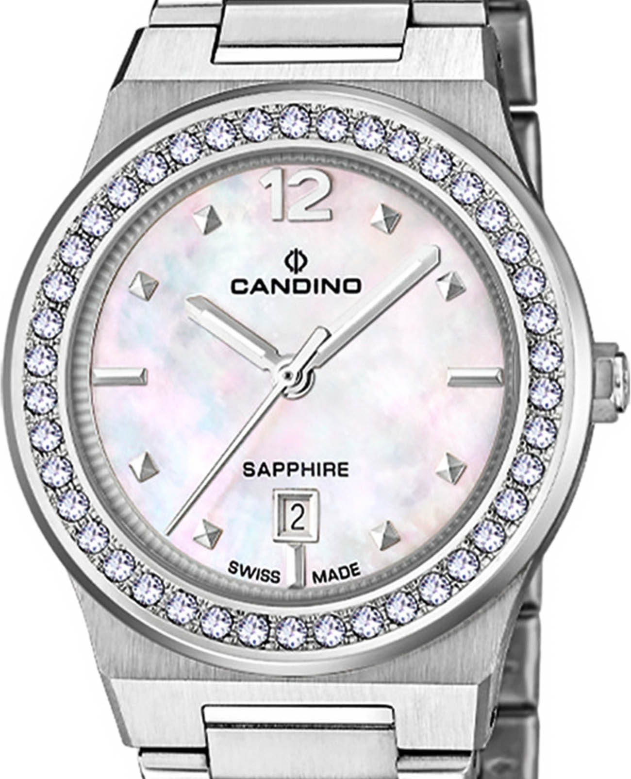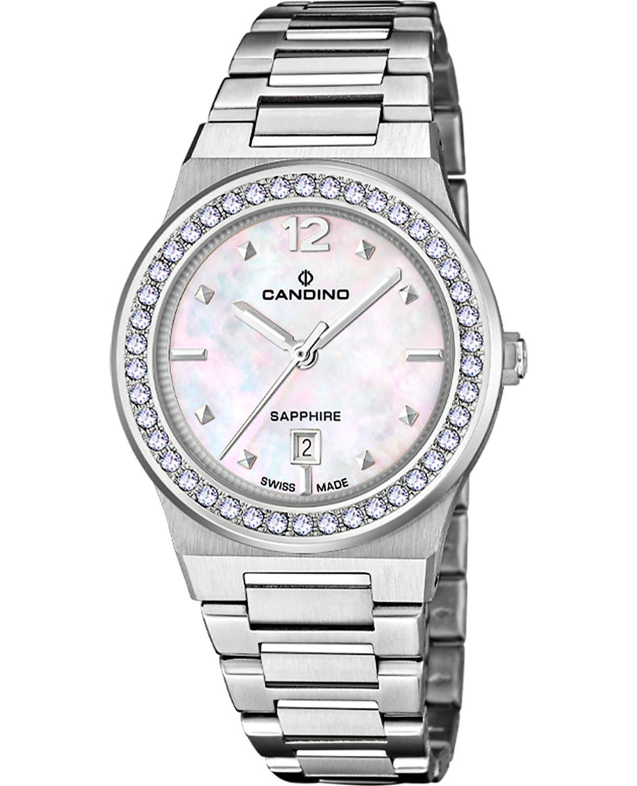 Женские кварцевые часы Candino из коллекции Lady Elegance — это элегантный аксессуар швейцарского производства, сочетающий изысканный дизайн и надёжность. Корпус круглой формы выполнен из стали серебряного цвета и защищён сапфировым стекломСапфировое стеклоПрочный и надёжный материал из кристалла сапфира синтетического происхождения, характеризующийся особой твёрдостью и устойчивостью к царапинам и повреждениям.. Безель украшен кристаллами, подчёркивая роскошь модели. Циферблат перламутрового цвета оформлен точками в качестве индикации, окошко даты расположено на отметке 6 часов. Стрелки и метки оснащены люминесцентным покрытиемЛюминесцентное покрытиеПозволяет считывать показания времени в темноте. Производители наносят на стрелки, часовые индексы, безель или поверхность циферблата светонакопительный состав, дающий холодное свечение. Luminova, обеспечивающим хорошую читаемость в темноте. Браслет из стали серебряного цвета фиксируется на раскладной застёжкеРаскладная застёжкаТакой тип застёжки используется только на браслетах из металла. Она никогда не раскрывается полностью, происходит разделение на 2 и более частей. Раскладывающая застёжка снизит вероятность потери часов к минимуму.. Водонепроницаемость составляет 50 WR, что позволяет использовать часы в повседневных условиях, защищая от случайных брызг и капель дождя. Модель идеально подходит для повседневного ношения, подчёркивая утончённый стиль и женственность.