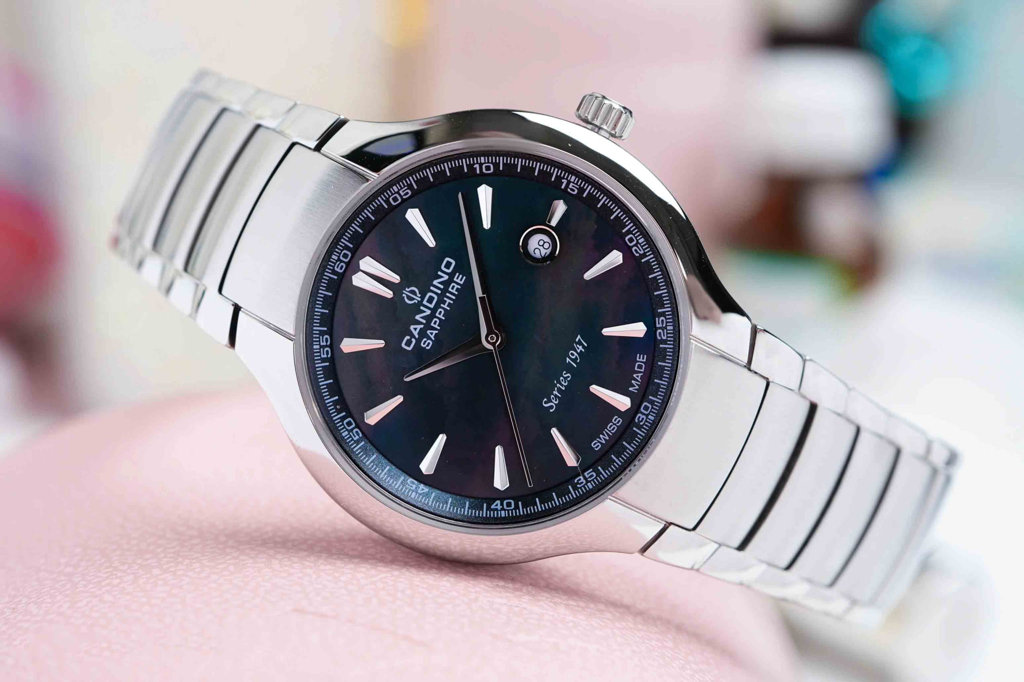 Женские кварцевые часы Candino — это сочетание элегантности и швейцарского качества. Корпус диаметром 34 мм и толщиной 8,6 мм выполнен из нержавеющей стали 316L. Циферблат чёрного цвета оформлен индексами, придающими изделию изысканность. Окошко даты расположено в положении 3 часов. Циферблат защищён сапфировым стекломСапфировое стеклоПрочный и надёжный материал из кристалла сапфира синтетического происхождения, характеризующийся особой твёрдостью и устойчивостью к царапинам и повреждениям., устойчивым к царапинам. Механизм — кварцевый, произведённый в Швейцарии. Часы оснащены стальным браслетом на застёжке «бабочка» с кнопкамиЗастёжка "бабочка"Такой вид застёжки дополняется предохранителями, помогающими избежать случайного раскрытия браслета. Обладают изящным исполнением. . Водонепроницаемость 100 м позволяет использовать часы для плавания и повседневного ношения. Гарантия — 2 года. Идеальный выбор для тех, кто ценит стиль, точность и надёжность.