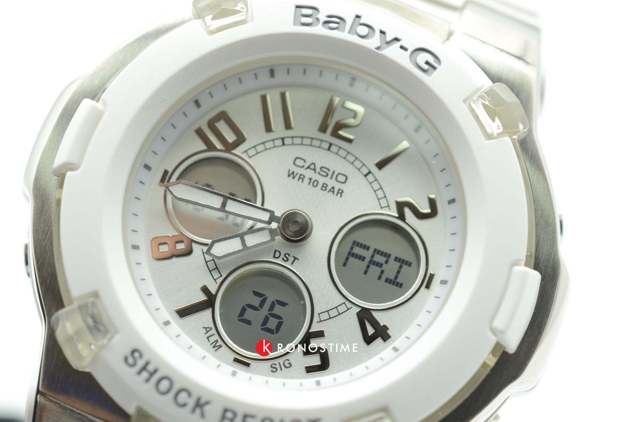 Современные надежные японские наручные женские часы. Точность хода: не хуже +/-15 секунд в месяц. Светодиодная подсветка с функцией автоматической подсветки при наклоне часов. Функция секундомера. Таймер обратного отсчета. 5 ежедневных будильников. Автоматический календарь. Функция мирового времени. Отображение времени в 12-часовом или 24-часовом формате. Особая ударопрочная конструкция защищает от ударов и вибрации. Минеральное стекло устойчивое к возникновению царапин. Ремешок из белого полимерного материала. Натуральный полимерный материал является идеальным для изготовления ремешка благодаря своей чрезвычайной прочности и гибкости. Корпус выполнен из высококачественного пластика. Задняя крышка стальная. Водонепроницаемость (10 Бар).