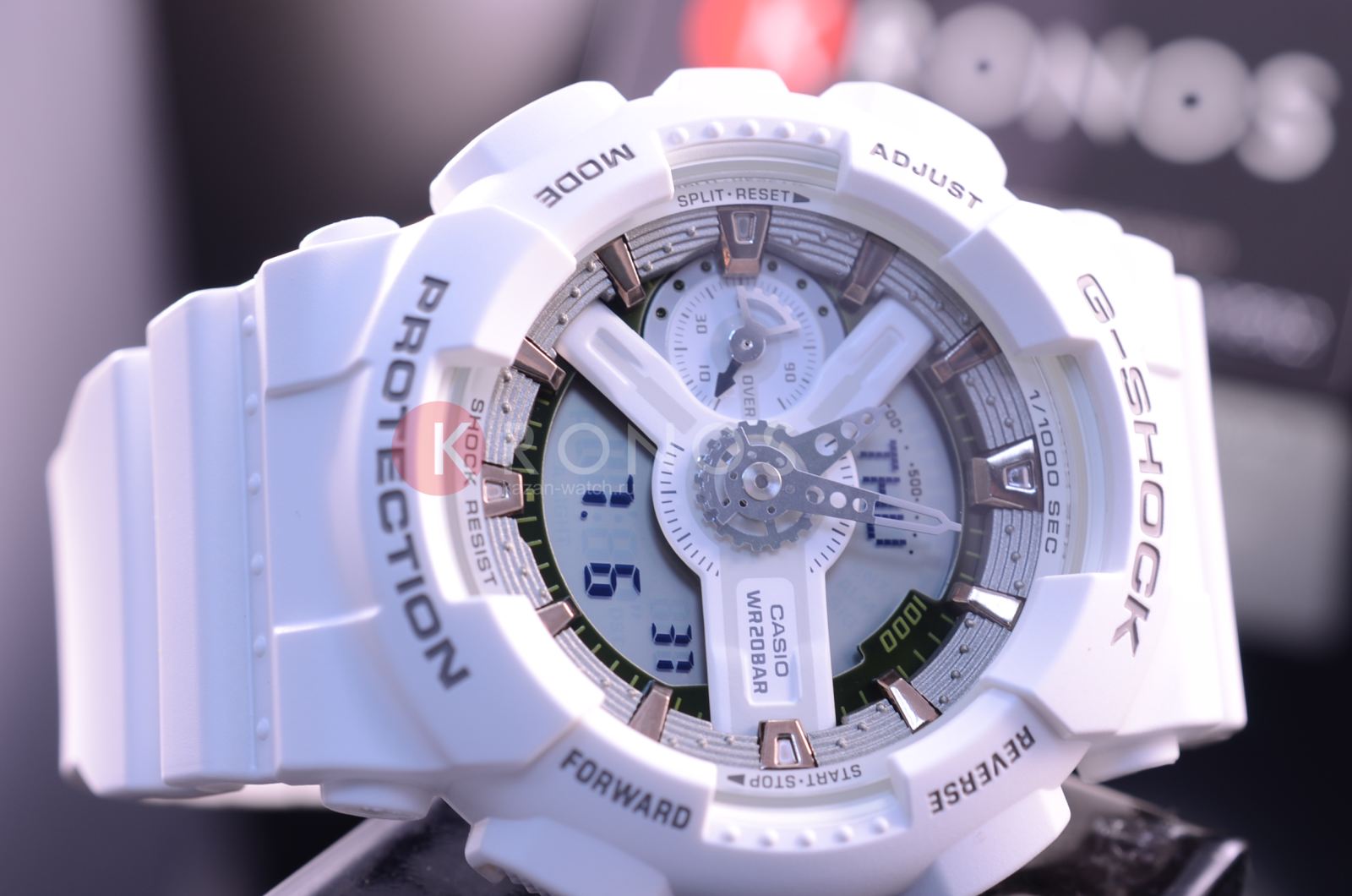 Белоснежная расцветка великолепно гармонирует с контрастными элементами циферблата. Несмотря на внушительный вес, модель отличается лёгким весом и комфортно сидит на запястье. Наручные часы обладают противоударным корпусомУдаропрочный корпусМеханизм заключён в корпус, выполненный из современных материалов, устойчивых к ударам, механическим повреждениям и падению с высоты: инновационный пластик, карбон, нержавеющая сталь, титан., который стойко переносит удары и падения с высоты. Он надёжно защищает японский кварцевый механизм, благодаря которому часы показывают время с абсолютной точностью. Батарейка рассчитана на 3 года работы. Автоматическая светодиодная подсветкаСветодиодная подсветкаСветодиодная или LED-подсветка обеспечивает появление яркого холодного свечения за счёт LED-элементов - маленьких лампочек. Они потребляют минимальное количество энергии, чаще всего можно встретить 1 светодиод, в нижней части циферблата. циферблата. Минеральное стекло. Сохранение водонепроницаемости до 20 бар. Функции: мировое времяМировое время Полезное часовое усложнение, отображающее время в основных городах и известных областях по всему миру, оно связано с часовыми поясами, удобно для путешественников и бизнесменов. , таймер обратного отсчёта, хронографХронографФункция позволяет измерять отрезки времени с особой точностью: часы, минуты, секунды. Верным признаком хронографа является наличие на циферблате 3 дополнительных окошек-счётчиков., будильник, автоматический календарь, UTCUTCВсемирное кординационное время, не имеющее привязки к географическому положению Гринвича, основывается на атомном отсчёте времени. Регулировка времени осуществляется более точно, чем устаревшее GMT.
