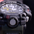 Японские мужские часы из коллекции G-Shock помогут завершить повседневный образ и порадуют владельца широким функционалом. Наручные часы серии Mudmaster привлекают брутальным дизайном с внушительным ударопрочным корпусомУдаропрочный корпусМеханизм заключён в корпус, выполненный из современных материалов, устойчивых к ударам, механическим повреждениям и падению с высоты: инновационный пластик, карбон, нержавеющая сталь, титан.. Они выполнены в стиле милитари, сочетая в себе узнаваемое оформление, прочные материалы и современные технологии. Привлекательно смотрится полимерный ремешок цвета хаки, обеспечивающий комфортное ношение. Циферблат защищает сапфировое стеклоСапфировое стеклоПрочный и надёжный материал из кристалла сапфира синтетического происхождения, характеризующийся особой твёрдостью и устойчивостью к царапинам и повреждениям. с антибликовым покрытием, устойчивое к возникновению царапин на поверхности. Корпус из высококачественного пластика. Двойная электролюминесцентная подсветкаЭлектролюминесцентная подсветкаЭлектролюминесцентная панель устанавливается под ЖК-экраном часов, при нажатии кнопки электричество преобразуется в свет за счёт подачи напряжения на атомы фосфора, такой тип подсветки позволяет освещать весь циферблат.. Питание от солнечной батареи Tough SolarTough SolarТехнология основана на подзарядке аккумулятора от источника солнечного света, специальная панель улавливает солнечные лучи и преобразует их в энергию для работы часов. Достаточно пары минут нахождения на солнце для функционирования часов в течении суток.. Индикатор заряда батарейки. Устойчивость к грязи и пыли. Включение и выключение звука кнопок. Функции: цифровой компас, барометр, термометр от -10° С до +60°С, UTCUTCВсемирное кординационное время, не имеющее привязки к географическому положению Гринвича, основывается на атомном отсчёте времени. Регулировка времени осуществляется более точно, чем устаревшее GMT.