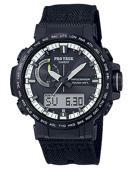 По сравнению с предыдущими моделями линейки Casio PRW-6000 аксессуар получился более тонким и компактным. Наручные часы выполнены в спортивном стиле, тёмный циферблат дополнен контрастными элементами. Ударопрочный корпусУдаропрочный корпусМеханизм заключён в корпус, выполненный из современных материалов, устойчивых к ударам, механическим повреждениям и падению с высоты: инновационный пластик, карбон, нержавеющая сталь, титан. выполнен из полимера, такой материал отлично поглощает силу удара и вибрации. Стильно выглядит текстильный ремешок, обеспечивающий комфорт при ношении. Питание от солнечной энергии , есть индикатор уровня заряда батарейки. Минеральное стекло. Водозащита 10 бар. Функционал: барометр, высотомер с памятью данных, таймер, термометр, будильник, мировое времяМировое время Полезное часовое усложнение, отображающее время в основных городах и известных областях по всему миру, оно связано с часовыми поясами, удобно для путешественников и бизнесменов. , компас. Светодиодная подсветкаСветодиодная подсветкаСветодиодная или LED-подсветка обеспечивает появление яркого холодного свечения за счёт LED-элементов - маленьких лампочек. Они потребляют минимальное количество энергии, чаще всего можно встретить 1 светодиод, в нижней части циферблата. экрана, стрелки с люминесцентным покрытиемЛюминесцентное покрытиеПозволяет считывать показания времени в темноте. Производители наносят на стрелки, часовые индексы, безель или поверхность циферблата светонакопительный состав, дающий холодное свечение.. Габариты: 50,5 x 47,2 x 12 мм.