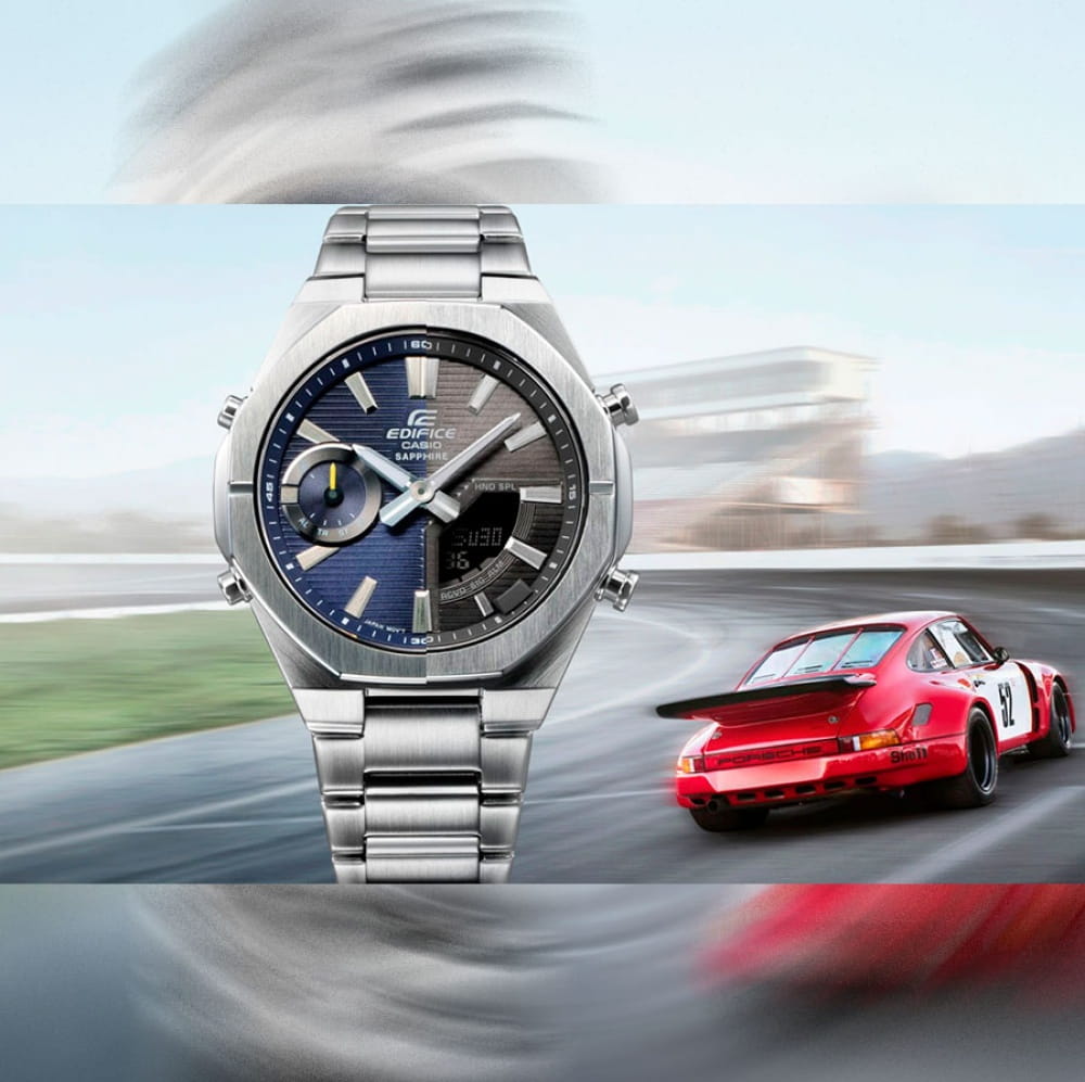 Японские мужские наручные часы Casio Edifice ECB-S10D-2A — это высокотехнологичный аксессуар для тех, кто ценит точность, стиль и современные инновации. Модель из коллекции Edifice , оснащённая технологией Bluetooth®, объединяет в себе классический дизайн и цифровые функции, делая каждое использование по-настоящему удобным. Корпус диаметром 43 мм выполнен из прочной нержавеющей стали , что придаёт модели благородства и долговечности. Циферблат синего цвета изготовлен по технологии Sunray (солнечные лучи) , обеспечивая глубину и игру света. Защиту механизму обеспечивает сапфировое стеклоСапфировое стеклоПрочный и надёжный материал из кристалла сапфира синтетического происхождения, характеризующийся особой твёрдостью и устойчивостью к царапинам и повреждениям., устойчивое к царапинам и с антибликовым покрытием для лучшей читаемости. Часы работают на кварцевом механизме с поддержкой BluetoothBluetoothСовременная технология, позволяющая синхронизировать часы с телефоном и переносить данные. Часы с Bluetooth расширяют возможности вашего смартфона и делают его использование ещё более удобным. , что позволяет синхронизировать их со смартфоном через специальное приложение CASIO WATCHES . Это даёт возможность автоматически корректировать время, устанавливать будильники, отслеживать дни недели на 6 языках , включая русский, а также выбирать время в до 300 городов мира . Также реализована функция перемещения стрелок , которая открывает обзор цифровых окон, и функция поиска телефона. Модель предлагает широкий набор функций: — Секундомер с точностью 1/100 секунды и временем измерения до 24 часов ; — SPLIT-хронографСплит-хронографИспользуется для измерения продолжительности нескольких временных отрезков, начинающихся одновременно, а заканчивающихся в разное время.; — ТаймерТаймерОтсчитывает секунды в обратном направлении в заданном интервале времени. обратного отсчёта от 1 секунды до 24 часов ; — 5 независимых будильников и ежечасный сигнал ; — отображение времени в формате 12/24 часа ; — автоматический календарь с возможностью отображения дня недели до 2099 года; — включение/выключение звука кнопок и авиарежим . Для комфортного использования в темное время стрелки покрыты люминесцентным составом NeobriteПодсветка NeobriteИспользование светонакопительных составов на основе сульфида цинка или алюмината стронция, яркий свет можно наблюдать на протяжении 6-10 часов после «зарядки» часов около источника света., который заряжается на свету и долго светится в темноте. Часы также имеют двойную светодиодную подсветку циферблата , с регулировкой длительности свечения (1.5 или 3 секунды), что делает их особенно удобными в условиях слабого освещения. Часы обладают водозащитой WR100 , подходят для повседневного ношения и плавания без акваланга. Толщина корпуса составляет всего 9.6 мм , благодаря чему часы легко помещаются под манжетом рубашки и не вызывают дискомфорта при носке. Завершает образ стальной браслет с раскладывающейся тройной застежкой , обеспечивающий надежную фиксацию и комфортную посадку на запястье. Батарейка рассчитана на 2 года автономной работы , а вес модели составляет 129 грамм . Эта модель — идеальный выбор для тех, кто ценит современные технологии , классический стиль и точность японского качества . Casio Edifice — не просто хронограф, а полноценный спутник в деловой и повс