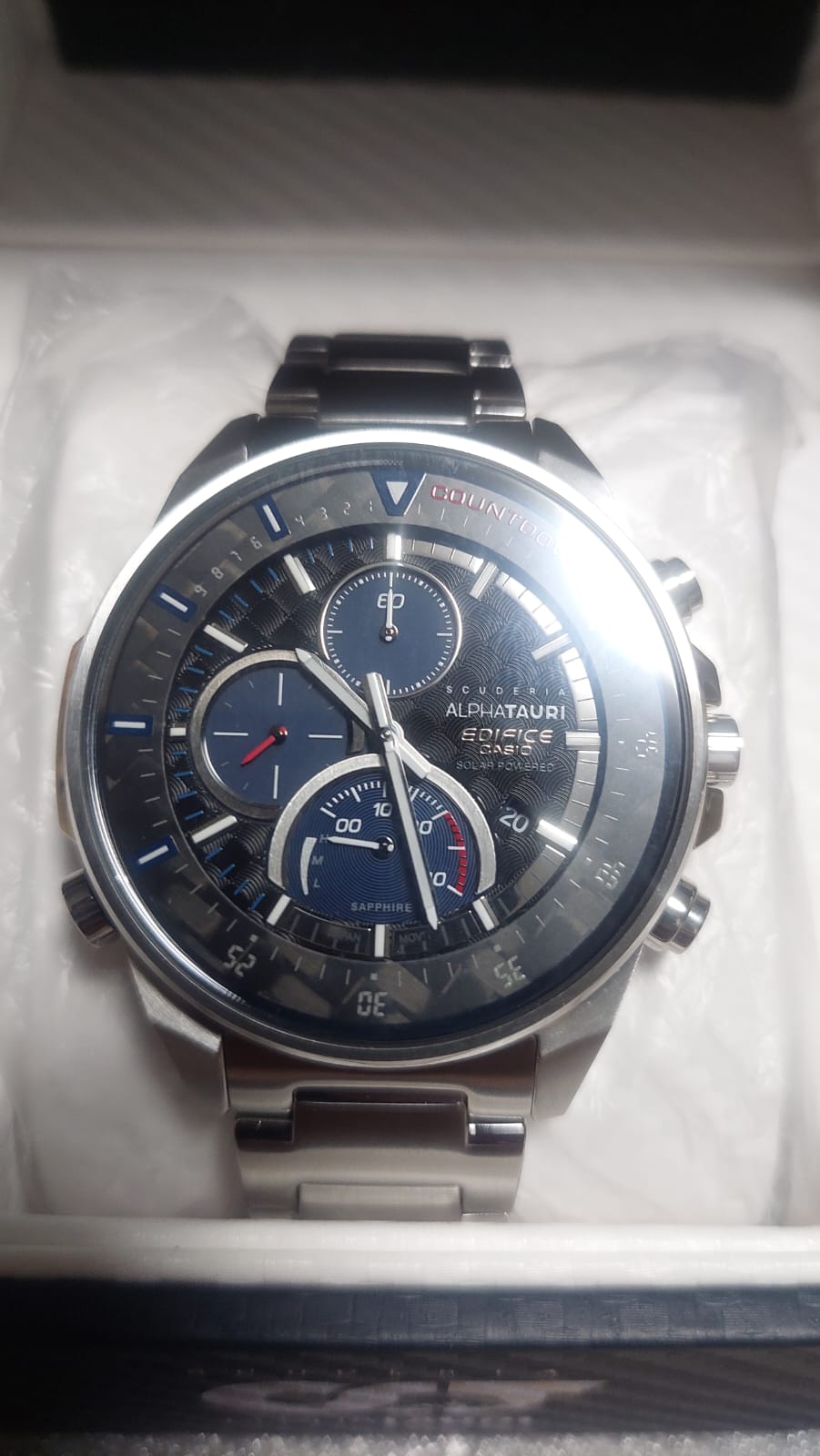 Коллаборация Edifice и итальянской гоночной команды Формулы-1 Scuderia AlphaTauri из серии EFS-S590 в стальном корпусе на стальном браслете. Лимитированная серия. Casio Edifice EFS-S590AT-1A из коллекции Edifice раскрывают автомобильную тематику.