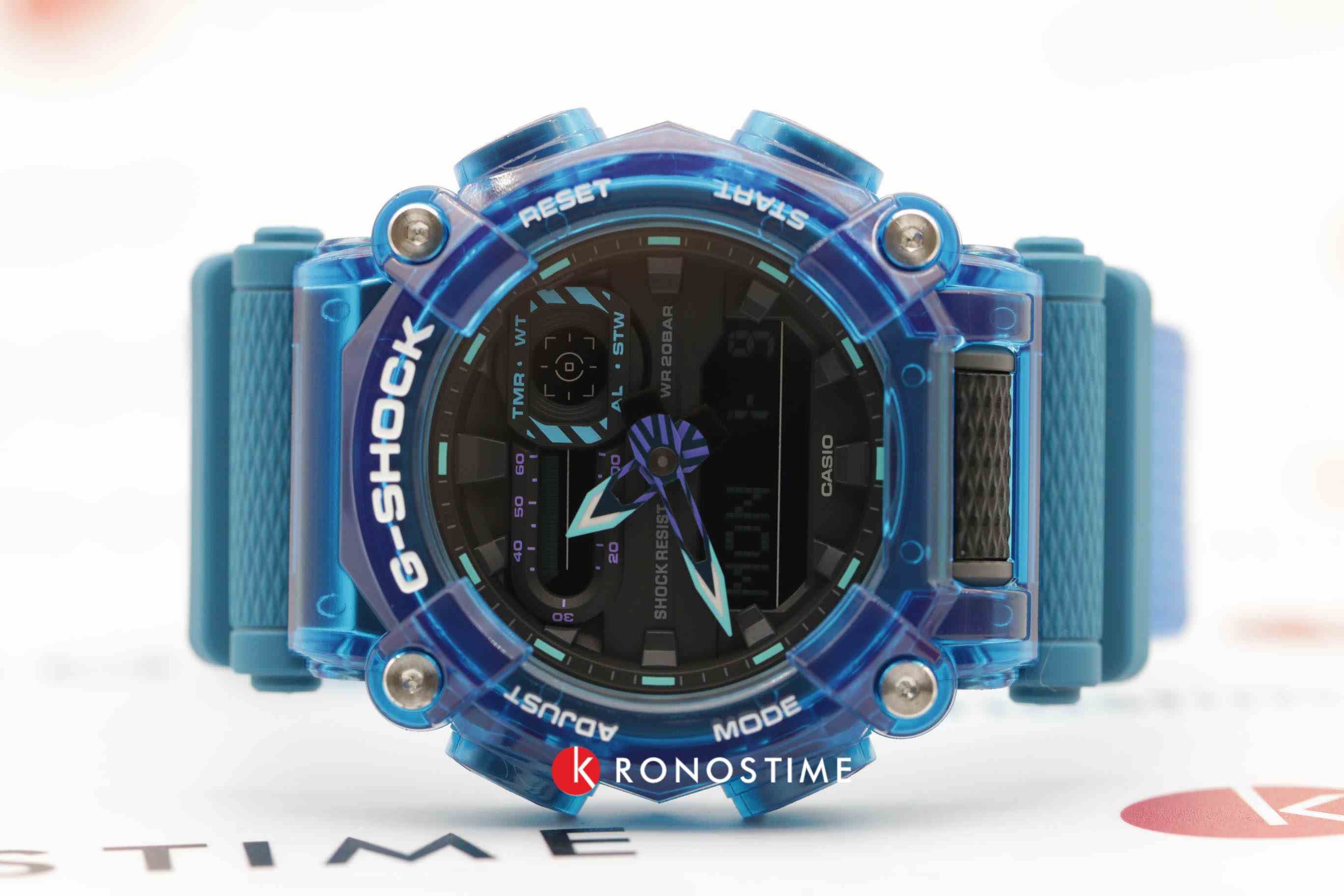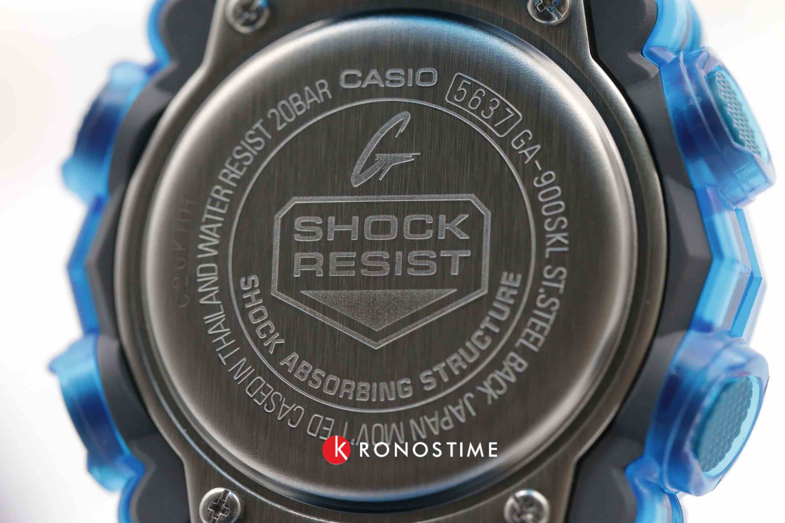 Мужские японские противоударные часы с хронографом Casio G-Shock GA-900SKL-2A, электронный механизм с высокой точностью. Класс водозащиты: 200 метров, позволит плавать, нырять и заниматься другими водными видами спорта. Корпус часов изготовлен из пластика, прозрачного цвета.
