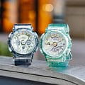 Японские ударопрочныеУдаропрочный корпусМеханизм заключён в корпус, выполненный из современных материалов, устойчивых к ударам, механическим повреждениям и падению с высоты: инновационный пластик, карбон, нержавеющая сталь, титан. женские часы с хронографом Casio G-Shock GMA-S110GS-3A, кварцевый механизм с высокой точностью. Класс водозащиты: 200 метров, позволит плавать, нырять и заниматься другими водными видами спорта. Корпус часов изготовлен из пластика. Прозрачный ремешок и корпус в сочетании с двухцветными элементами циферблата создают сбалансированный, плавный, современный стиль. Циферблат с светодиодной подсветкойСветодиодная подсветкаСветодиодная или LED-подсветка обеспечивает появление яркого холодного свечения за счёт LED-элементов - маленьких лампочек. Они потребляют минимальное количество энергии, чаще всего можно встретить 1 светодиод, в нижней части циферблата., функция автоподсветки освещает циферблат при повороте часов к лицу, функция Afterglow (для подсветки не нужно удерживать кнопку, выбор времени послесвечения). Цвет подсветки: оранжевый. Ударопрочный корпусУдаропрочный корпусМеханизм заключён в корпус, выполненный из современных материалов, устойчивых к ударам, механическим повреждениям и падению с высоты: инновационный пластик, карбон, нержавеющая сталь, титан. защищает механизм от ударов и вибрации. Защищены от магнитных полей. СекундомерСекундомерСекундоме́р — прибор, способный измерять интервалы времени с точностью до долей секунды. с точностью показаний 1/1000с и временем измерения 100ч. Сплит-хронографСплит-хронографИспользуется для измерения продолжительности нескольких временных отрезков, начинающихся одновременно, а заканчивающихся в разное время.. ТаймерТаймерОтсчитывает секунды в обратном направлении в заданном интервале времени. обратного отсчета от 1мин до 24ч с автоповтором. Мировое времяМировое время Полезное часовое усложнение, отображающее время в основных городах и известных областях по всему миру, оно связано с часовыми поясами, удобно для путешественников и бизнесменов. : 29 часовых поясов (48 городов + координированное универсальное время), включение/выключение перехода на летнее время, переключение городов домашнего/мирового времени. 12-ти и 24-х часовой формат времени.