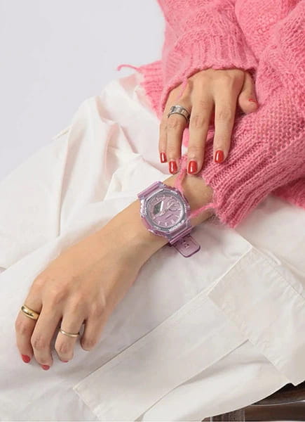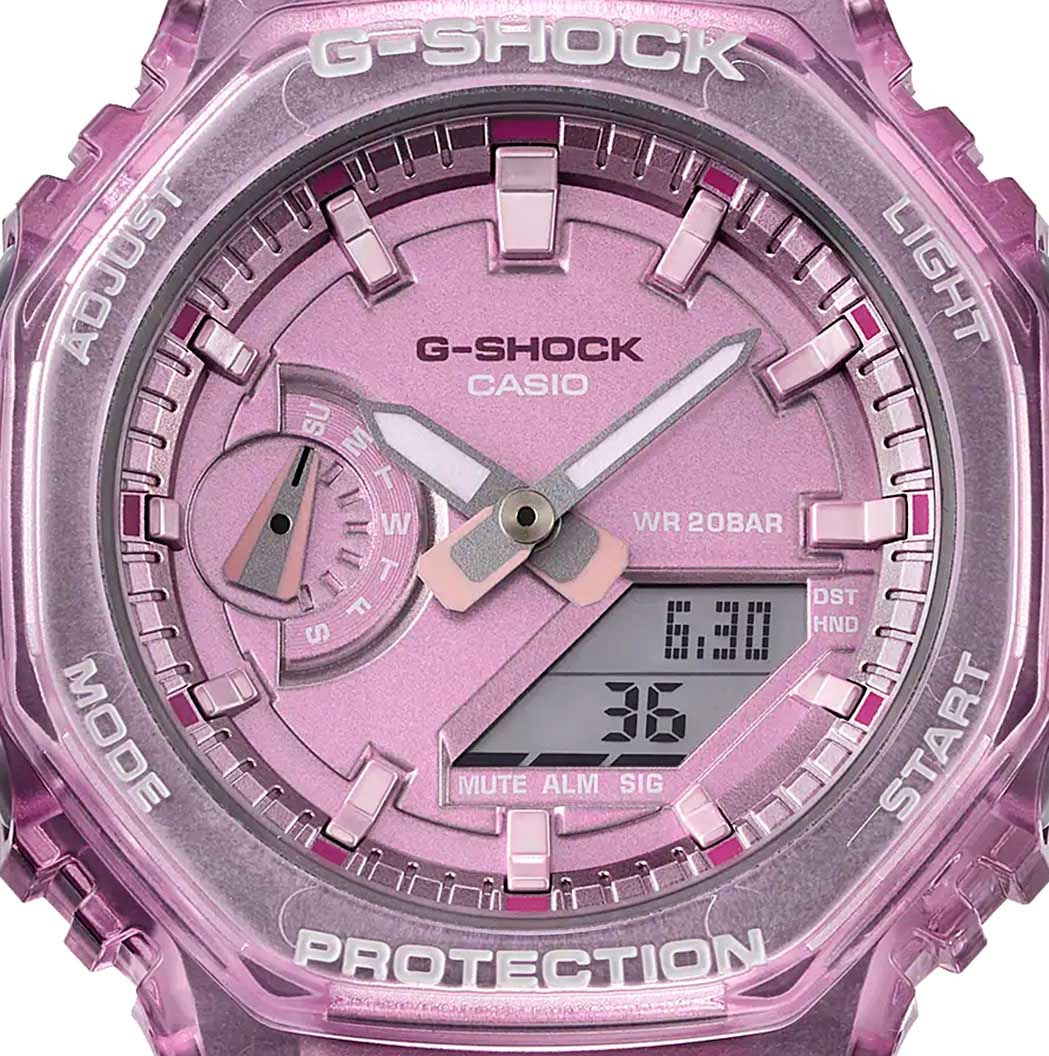 Ощутите всплеск прозрачного металлического удовольствия с популярной аналогово-цифровой комбинацией GA-2100 в более тонком и компактном корпусе. Японские ударопрочныеУдаропрочный корпусМеханизм заключён в корпус, выполненный из современных материалов, устойчивых к ударам, механическим повреждениям и падению с высоты: инновационный пластик, карбон, нержавеющая сталь, титан. женские часы с минеральным стекломМинеральное стеклоМинеральное стекло представляет собой искусственно выращенный минерал кварца. Такое стекло отличается особой устойчивостью к повреждениям и царапинам. Уступает по некоторым качествам сапфировому стеклу. Casio G-Shock GMA-S2100SK-4A, кварцевый механизм с высокой точностью. Класс водозащиты: 200 метров, позволит плавать, нырять и заниматься другими водными видами спорта. Корпус часов изготовлен из пластика. Индексные метки, обработанные полуматовым парофазным покрытием, оживляют прозрачный металлический вид. G-Shock. Часы со структурой Carbon Core GuardCarbon Core Guard Новейшая структура корпуса, разработанная Casio. Полиуретановая пластина дополнительно усилена карбоновыми вставками, что придаёт специальную защиту от механических повреждений. Карбон отличается лёгкостью и прочностью.. Ударопрочный корпусУдаропрочный корпусМеханизм заключён в корпус, выполненный из современных материалов, устойчивых к ударам, механическим повреждениям и падению с высоты: инновационный пластик, карбон, нержавеющая сталь, титан. с карбоновыми волокнами более прочный и, в то же время, более легкий. Этот же материал защищает внутренний модуль от повреждений и деформаций при ударах. Электролюминесцентная подсветкаЭлектролюминесцентная подсветкаЭлектролюминесцентная панель устанавливается под ЖК-экраном часов, при нажатии кнопки электричество преобразуется в свет за счёт подачи напряжения на атомы фосфора, такой тип подсветки позволяет освещать весь циферблат. освещает весь циферблат. Двойная подсветка Super Illuminator с функцией Afterglow (для подсветки не нужно удерживать кнопку, время послесвечения настраивается 1,5 или 3 сек): одновременно подсвечивается аналоговый циферблат и цифровой дисплей. Цвет подсветки: белый. Светонакопительное покрытие NeobriteПодсветка NeobriteИспользование светонакопительных составов на основе сульфида цинка или алюмината стронция, яркий свет можно наблюдать на протяжении 6-10 часов после «зарядки» часов около источника света. обеспечивает длительное послесвечение в темноте даже после кратковременного нахождения на свету. 12-ти и 24-х часовой формат времени. СекундомерСекундомерСекундоме́р — прибор, способный измерять интервалы времени с точностью до долей секунды. с разрешениями показаний: 1/100 сек (до 1 ч) и 1 сек (после 1 ч) и временем измерения 24 ч. Сплит-хронографСплит-хронографИспользуется для измерения продолжительности нескольких временных отрезков, начинающихся одновременно, а заканчивающихся в разное время.. ТаймерТаймерОтсчитывает секунды в обратном направлении в заданном интервале времени. обратного отсчета от 1 сек до 24 ч с автоповтором. Мировое времяМировое время Полезное часовое усложнение, отображающее время в основных городах и известных областях по всему миру, оно связано с часовыми поясами, удобно для путешественников и бизнесменов. – 48 городов (31 часовой пояс), всемирное координированное время (UTCUTC