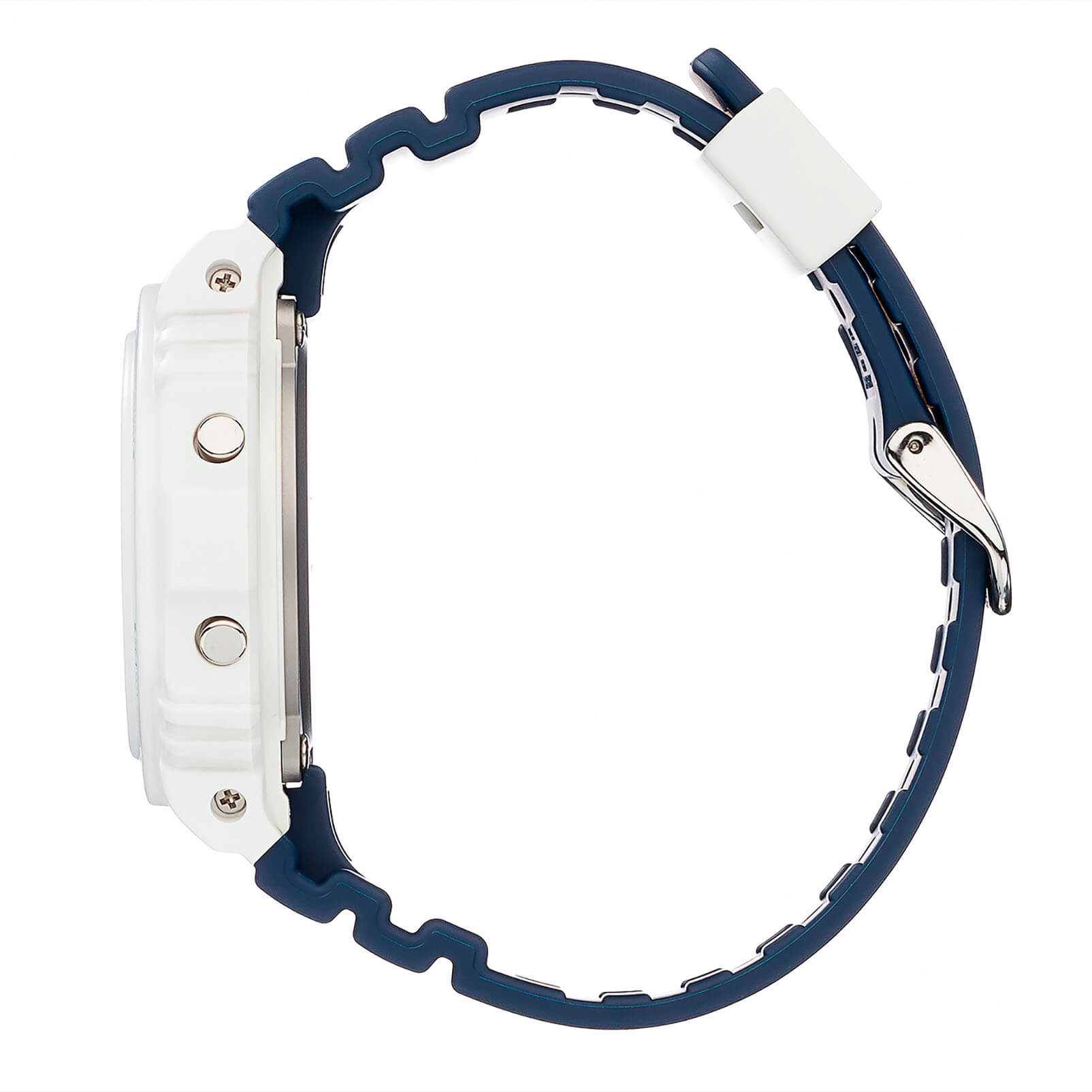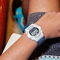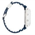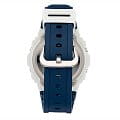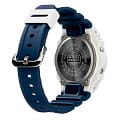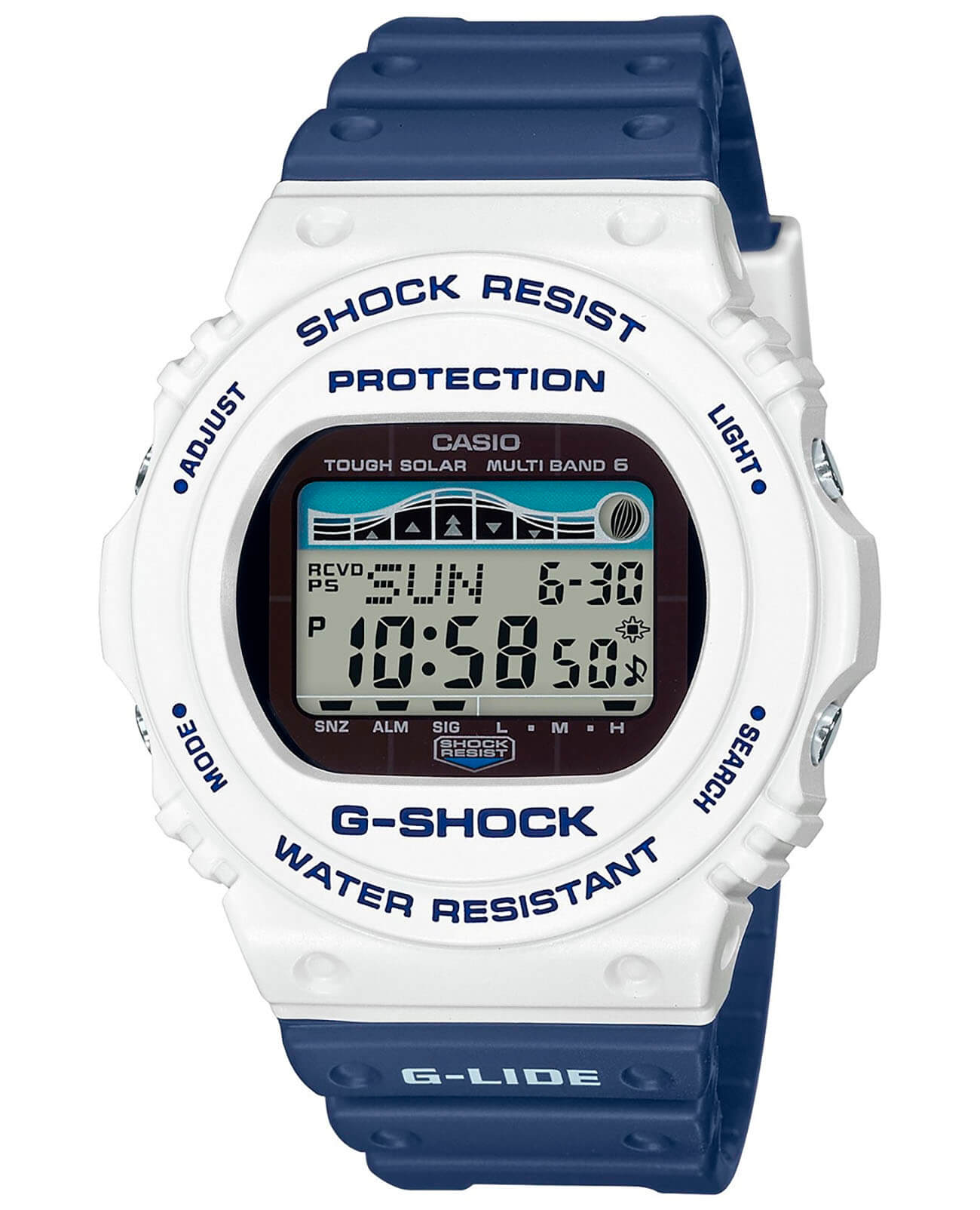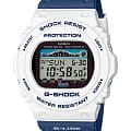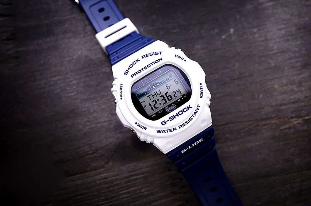 Электронные наручные часы в сине-белой цветовой гамме представляют собой современное исполнение знаменитого ударопрочного корпусаУдаропрочный корпусМеханизм заключён в корпус, выполненный из современных материалов, устойчивых к ударам, механическим повреждениям и падению с высоты: инновационный пластик, карбон, нержавеющая сталь, титан. 5700, по прототипу моделей 1987-го года. Они представлены в серии для серферов G-Shock G-Lide и помогают в выявлении идеальных погодных условий для покорения волн. Этому способствуют следующие функции: отображение фаз луны, график приливов и отливов, приём радиосигнала для корректировки времени, запись местоположения 100 сёрфинг-курортов, UTCUTCВсемирное кординационное время, не имеющее привязки к географическому положению Гринвича, основывается на атомном отсчёте времени. Регулировка времени осуществляется более точно, чем устаревшее GMT.