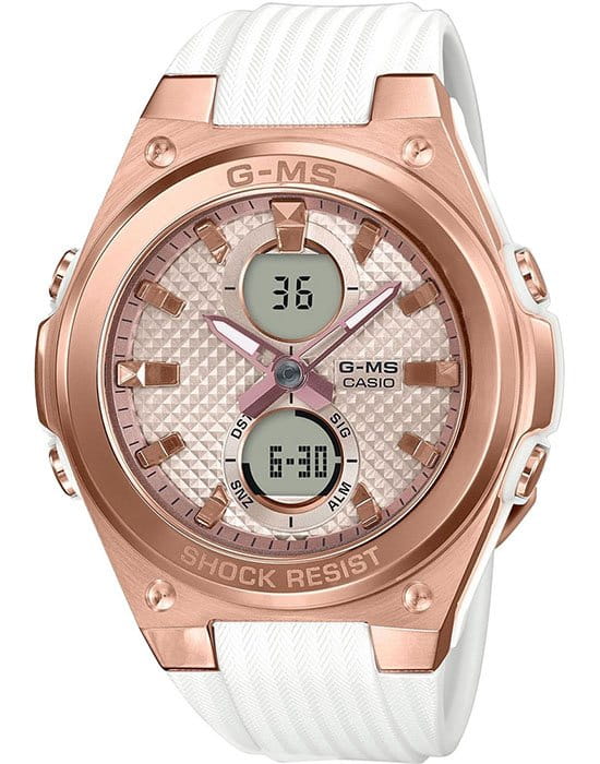 Аксессуар с белым фактурным циферблатом наделён противоударным корпусомУдаропрочный корпусМеханизм заключён в корпус, выполненный из современных материалов, устойчивых к ударам, механическим повреждениям и падению с высоты: инновационный пластик, карбон, нержавеющая сталь, титан. из полимерного пластика. Для усиления устойчивости к ударам безельБезельВнешний ободок, закрепляющий стекло. В спортивных часах так называется поворотное кольцо с делениями на циферблате, выполняет роль таймера – замеряет отрезки времени на шкале. Неподвижный безель – элемент декора. Однонаправленно вращающийся безель на дайверских часах позволяет фиксировать моменты погружения и выныривания на поверхность. сделан из хирургической стали 316L. IP-покрытиеIP-покрытиеМетод ионного напыления. Демонстрирует повышенную устойчивость к истиранию, окислению и химическим веществам. Под воздействием высокого давления и температуры около 1500°C молекулы металла надёжно соединяются с частицами корпуса часов. цвета розового золота защищает от царапин. Японский кварцевый механизм. Полимерный ремешок с узорчатой поверхностью. Минеральное стекло с закалкой. Водозащита до 10 бар. ЛюминесцентнаяЛюминесцентное покрытиеПозволяет считывать показания времени в темноте. Производители наносят на стрелки, часовые индексы, безель или поверхность циферблата светонакопительный состав, дающий холодное свечение. и светодиодная подсветкаСветодиодная подсветкаСветодиодная или LED-подсветка обеспечивает появление яркого холодного свечения за счёт LED-элементов - маленьких лампочек. Они потребляют минимальное количество энергии, чаще всего можно встретить 1 светодиод, в нижней части циферблата.. Будильник, таймер, секундомер с точностью в 1/100 секунды, хронографХронографФункция позволяет измерять отрезки времени с особой точностью: часы, минуты, секунды. Верным признаком хронографа является наличие на циферблате 3 дополнительных окошек-счётчиков., ежечасный сигнал, мировое времяМировое время Полезное часовое усложнение, отображающее время в основных городах и известных областях по всему миру, оно связано с часовыми поясами, удобно для путешественников и бизнесменов. . Габариты: 45,1 x 40,3 x 12,4 мм.