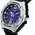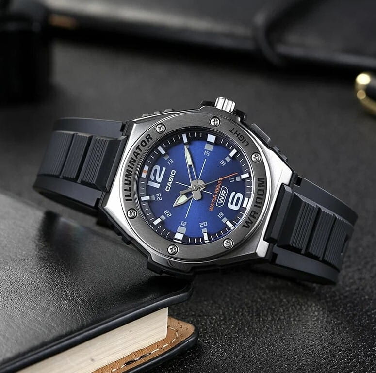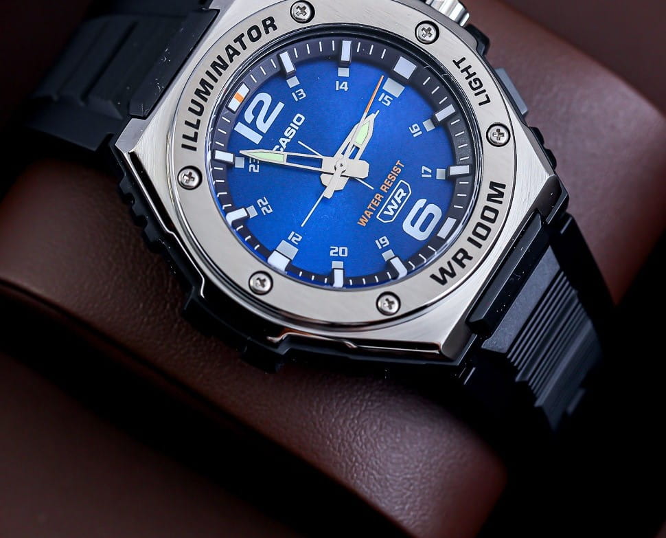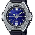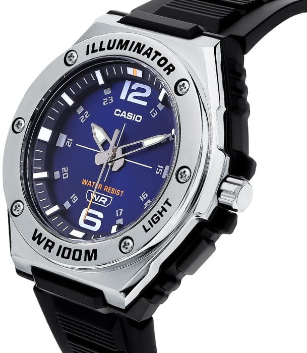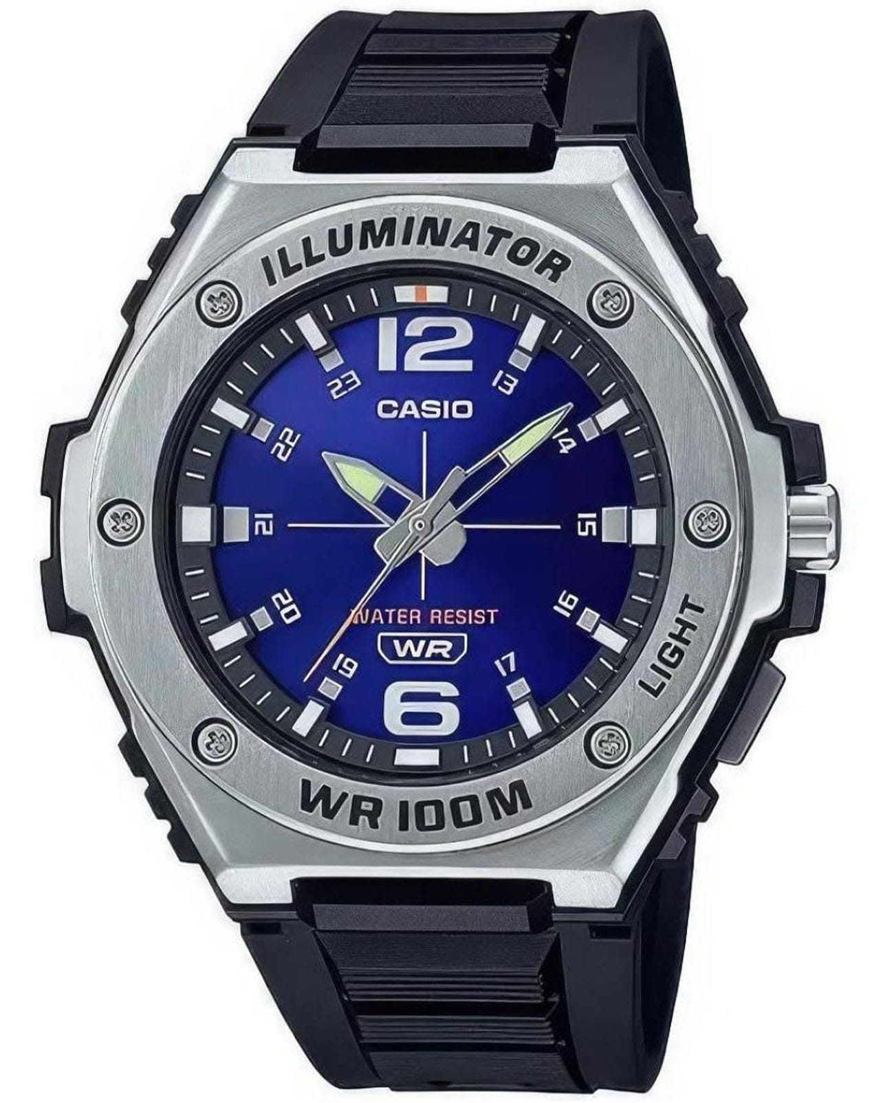 Спортивные японские мужские часы Casio Collection MWA-100H-2A, кварцевый механизм с высокой точностью. Класс водозащиты: 100 метров, позволит плавать, нырять и заниматься другими водными видами спорта. Корпус часов изготовлен из пластика. Циферблат подсвечивается ярким светодиодомСветодиодная подсветкаСветодиодная или LED-подсветка обеспечивает появление яркого холодного свечения за счёт LED-элементов - маленьких лампочек. Они потребляют минимальное количество энергии, чаще всего можно встретить 1 светодиод, в нижней части циферблата.. Послесвечение. Цвет подсветки: оранжевый. 12-ти и 24-х часовой формат времени. Циферблат выполнен по технологии Sunray (солнечные лучи). Метки в виде штрихов и двух арабских цифр. Заводная головка с защитой. Задняя крышка крепится на 4-х винтах. Ремешок из полимерного материала с классической застежкой.