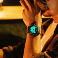 Неподвижный безельБезельВнешний ободок, закрепляющий стекло. В спортивных часах так называется поворотное кольцо с делениями на циферблате, выполняет роль таймера – замеряет отрезки времени на шкале. Неподвижный безель – элемент декора. Однонаправленно вращающийся безель на дайверских часах позволяет фиксировать моменты погружения и выныривания на поверхность. из стали с IP-покрытиемIP-покрытиеМетод ионного напыления. Демонстрирует повышенную устойчивость к истиранию, окислению и химическим веществам. Под воздействием высокого давления и температуры около 1500°C молекулы металла надёжно соединяются с частицами корпуса часов.. Функции мирового времениМировое время Полезное часовое усложнение, отображающее время в основных городах и известных областях по всему миру, оно связано с часовыми поясами, удобно для путешественников и бизнесменов. – 29 часовых поясов и UTCUTCВсемирное кординационное время, не имеющее привязки к географическому положению Гринвича, основывается на атомном отсчёте времени. Регулировка времени осуществляется более точно, чем устаревшее GMT.