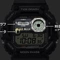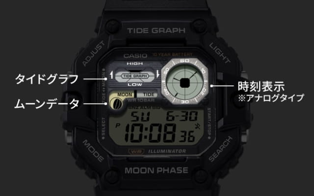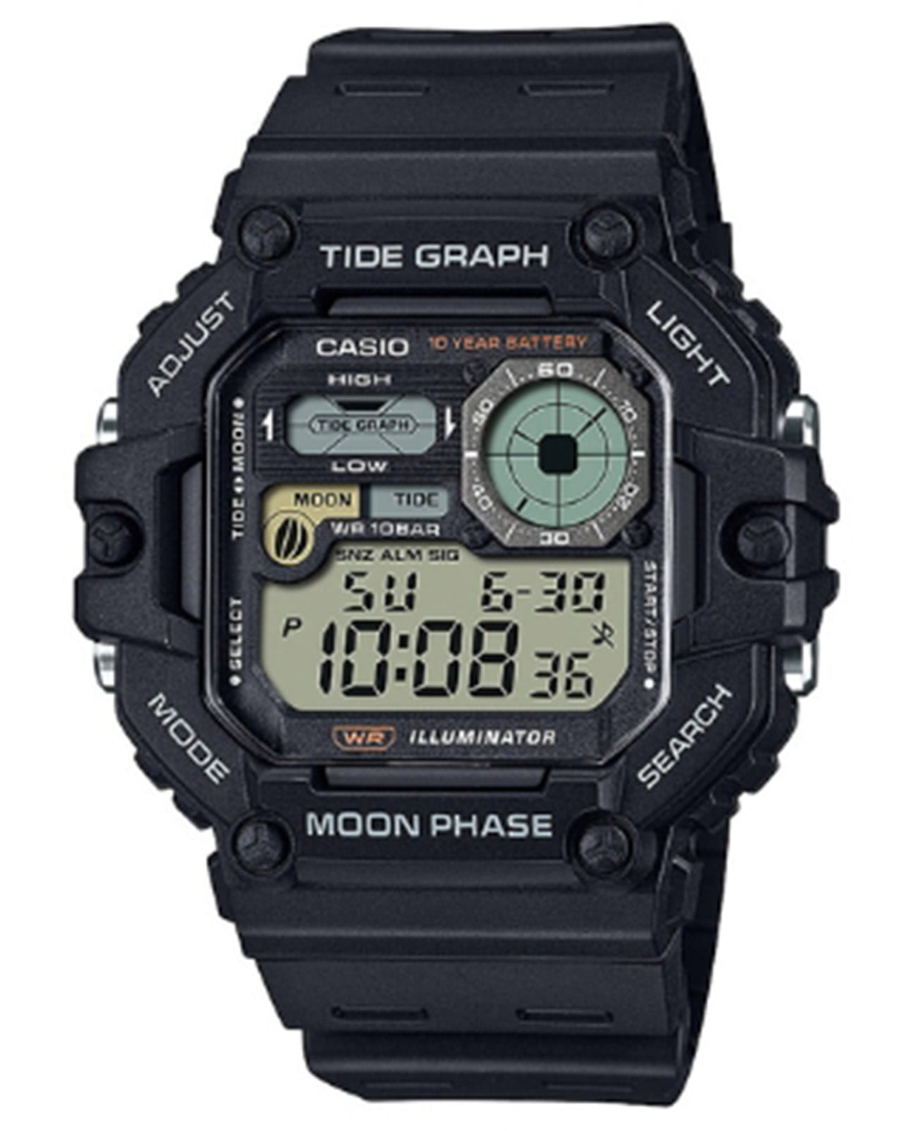 Многофункциональные часы Casio WS-1700H-1AVDF с секундомеромСекундомерСекундоме́р — прибор, способный измерять интервалы времени с точностью до долей секунды. и таймеромТаймерОтсчитывает секунды в обратном направлении в заданном интервале времени. отлично подойдут для занятий спортом. Часы выдерживают давление до 10 АТМ и имеют впечатляющий срок службы батареи — около 10 лет. Используется батарея CR2025. Кварцевый механизм с высокой точностью. Модель оснащена двойным временем, секундомером с точностью до 1/100 секунды, таймером и мульти-будильником. Органическое стекло. Класс водозащиты: 100 метров, позволит плавать, нырять и заниматься другими водными видами спорта. Корпус из пластика. На ЖК-экране отображаются не только время и дата, но и дополнительная информация, такая как график приливов и отливов, данные о фазах Луны и аналоговое время. Добавлена светодиодная подсветкаСветодиодная подсветкаСветодиодная или LED-подсветка обеспечивает появление яркого холодного свечения за счёт LED-элементов - маленьких лампочек. Они потребляют минимальное количество энергии, чаще всего можно встретить 1 светодиод, в нижней части циферблата. янтарного цвета для улучшения видимости в темноте. Силикованный ремень с классической застежкой.