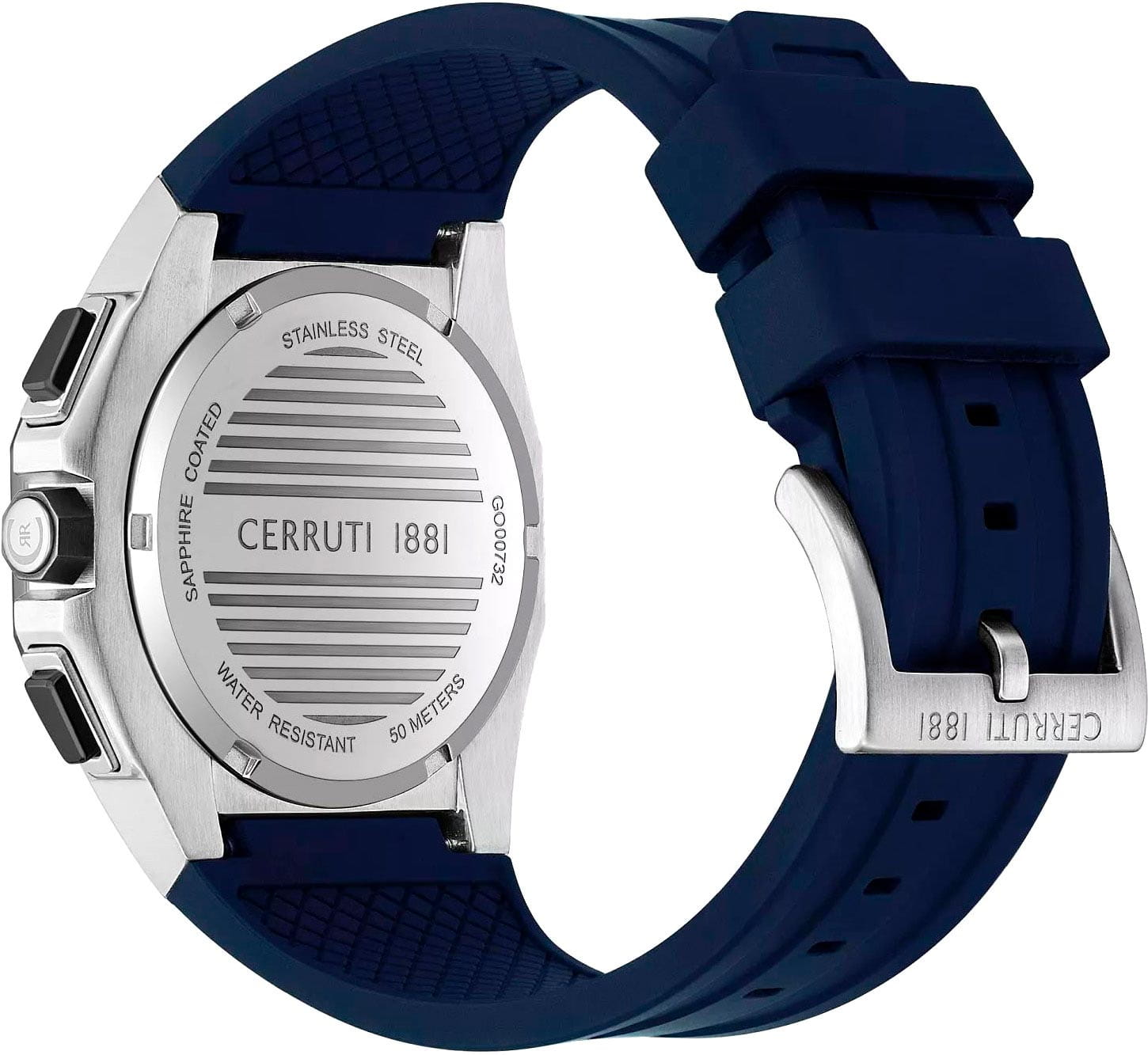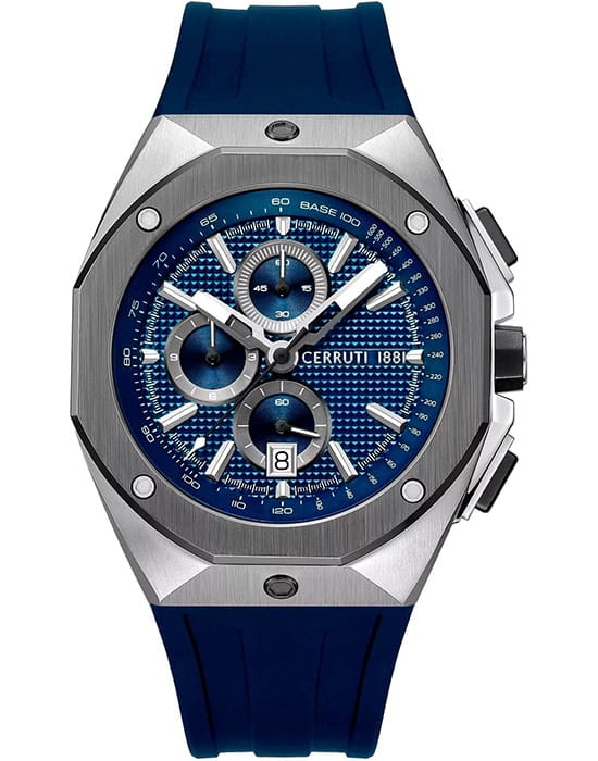 Cerruti 1881 CIWGO0073202 — выразительные мужские часы с мощным спортивным характером и акцентом на геометрическую точность форм. Корпус из нержавеющей стали с чётко очерченным восьмигранным безелемБезельВнешний ободок, закрепляющий стекло. В спортивных часах так называется поворотное кольцо с делениями на циферблате, выполняет роль таймера – замеряет отрезки времени на шкале. Неподвижный безель – элемент декора. Однонаправленно вращающийся безель на дайверских часах позволяет фиксировать моменты погружения и выныривания на поверхность. придаёт модели современный архитектурный облик, а насыщенный синий циферблат с рельефной структурой и тремя счётчиками хронографаХронографФункция позволяет измерять отрезки времени с особой точностью: часы, минуты, секунды. Верным признаком хронографа является наличие на циферблате 3 дополнительных окошек-счётчиков. подчёркивает её функциональность и динамику. Контрастные стрелки и метки с люминесцентным покрытиемЛюминесцентное покрытиеПозволяет считывать показания времени в темноте. Производители наносят на стрелки, часовые индексы, безель или поверхность циферблата светонакопительный состав, дающий холодное свечение. обеспечивают удобство считывания показаний в любое время суток, а устойчивое к повреждениям минеральное стеклоМинеральное стеклоМинеральное стекло представляет собой искусственно выращенный минерал кварца. Такое стекло отличается особой устойчивостью к повреждениям и царапинам. Уступает по некоторым качествам сапфировому стеклу. надёжно защищает циферблат. Эластичный силиконовый ремешок глубокого синего цвета гармонирует с общим тоном дизайна и гарантирует комфортное прилегание. Cerruti 1881— это стильное воплощение итальянской эстетики, объединяющее точность, уверенность и современную силу образа.